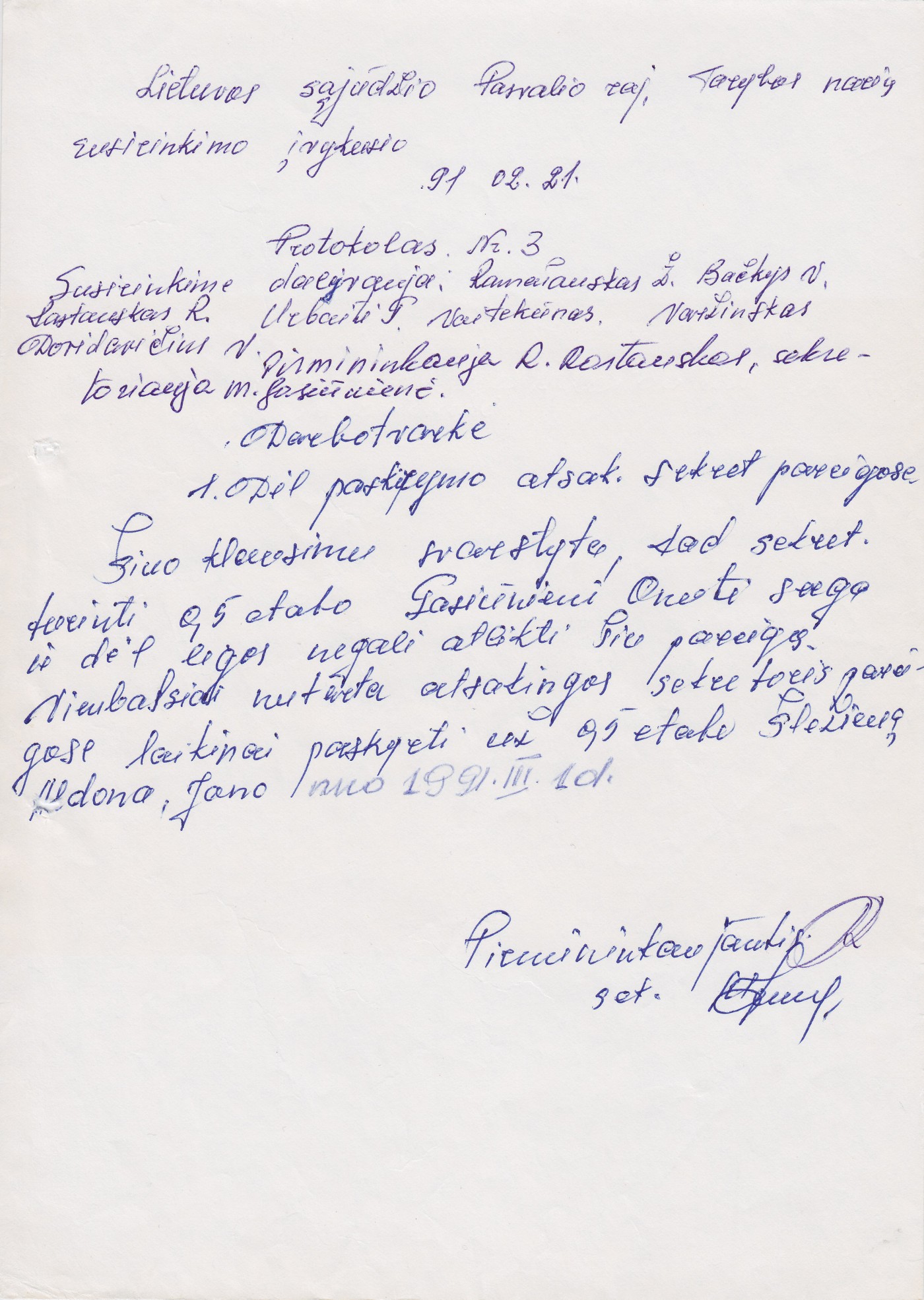 Lietuvos Sajūdžio Pasvalio rajono Tarybos narių susirinkimo, įvykusio 1991.02.21, Protokolas Nr. 3