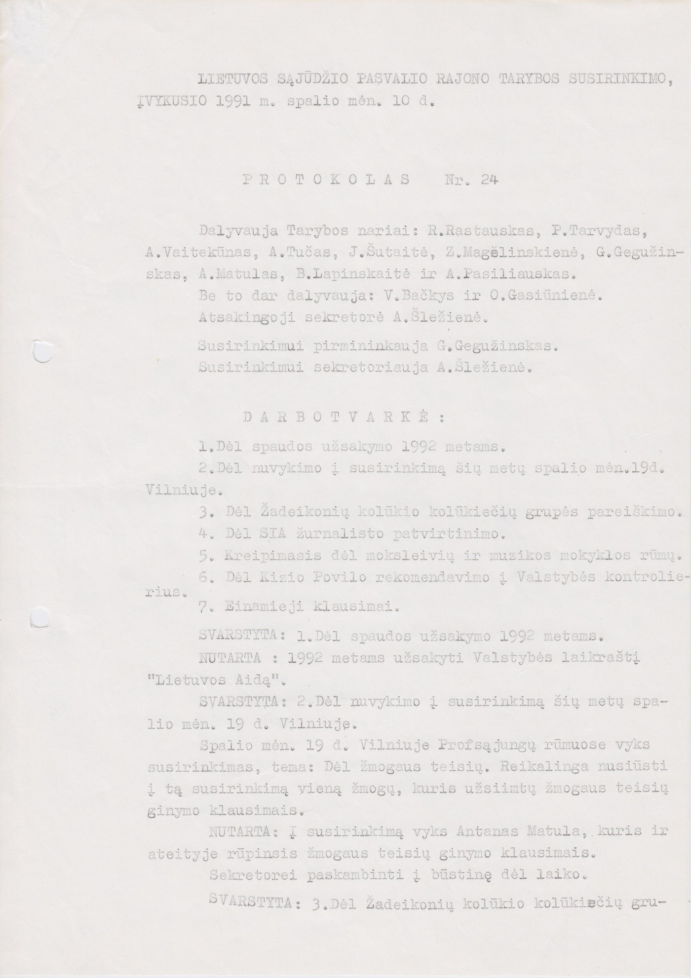 Lietuvos Sajūdžio Pasvalio rajono Tarybos susirinkimo, įvykusio 1991 m. spalio 10 d., PROTOKOLAS Nr. 24