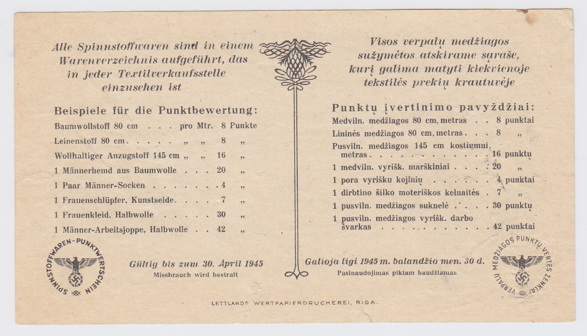 Rytų krašto verpalų medžiagos punktų vertės ženklas už pristatytus linus ir vilnas. Šio ženklo savininkas turi teisę pirkti už penkis punktus verpalų medžiagos