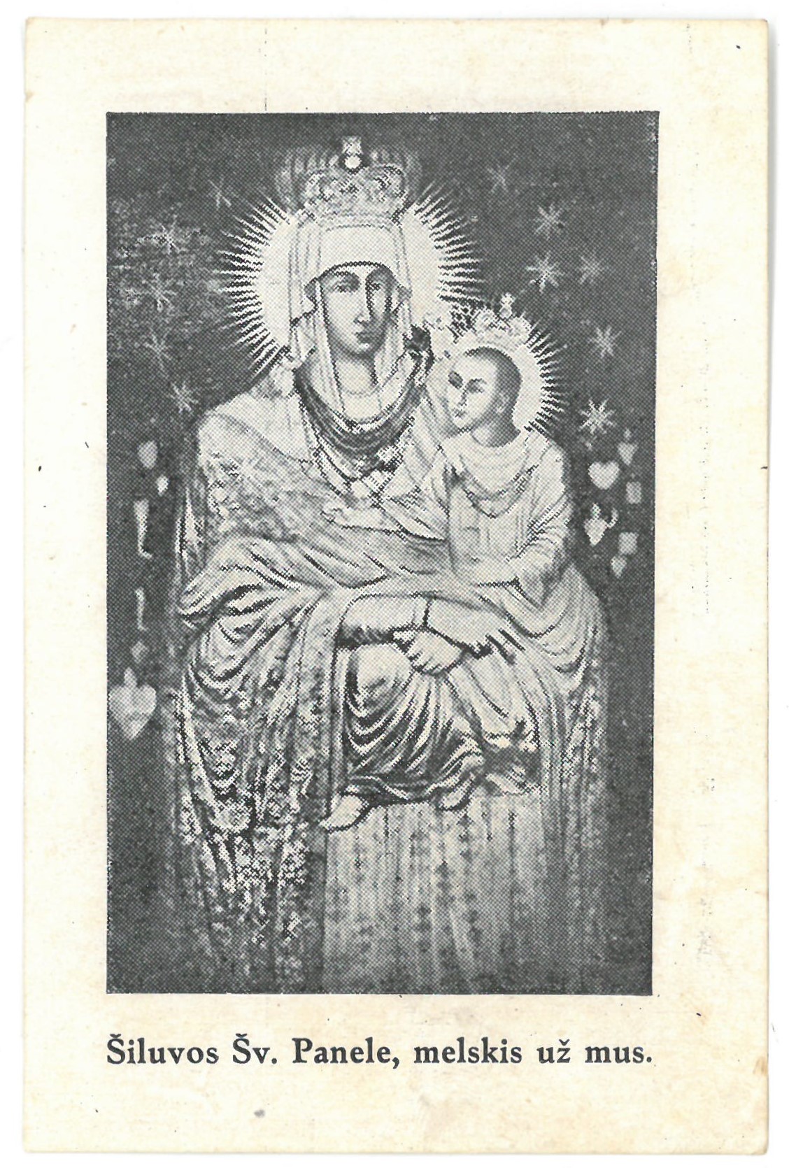 Religinis paveikslėlis. „Šiluvos Šv. Panele, melskis už mus“. Kitoje paveikslėlio pusėje – malda