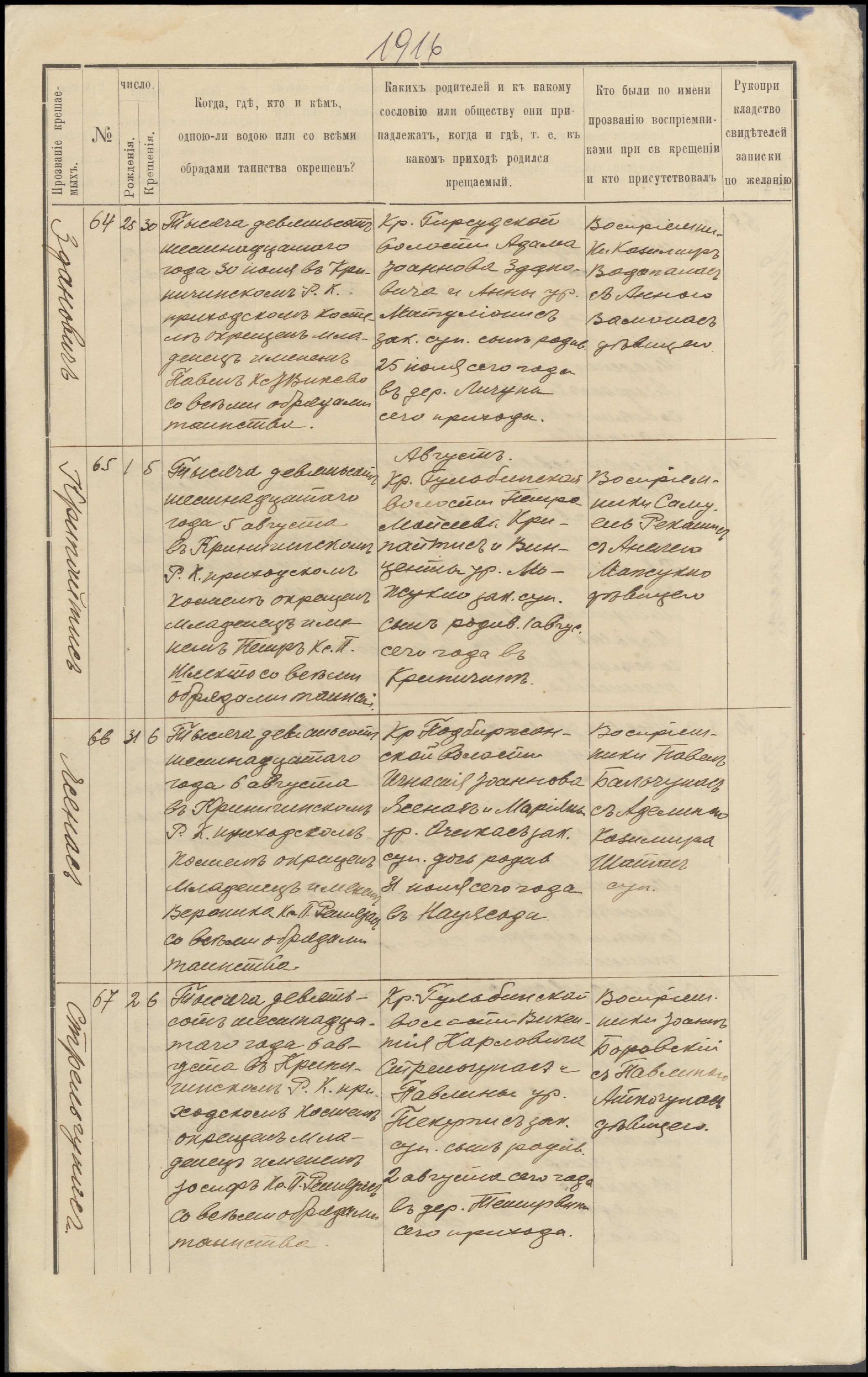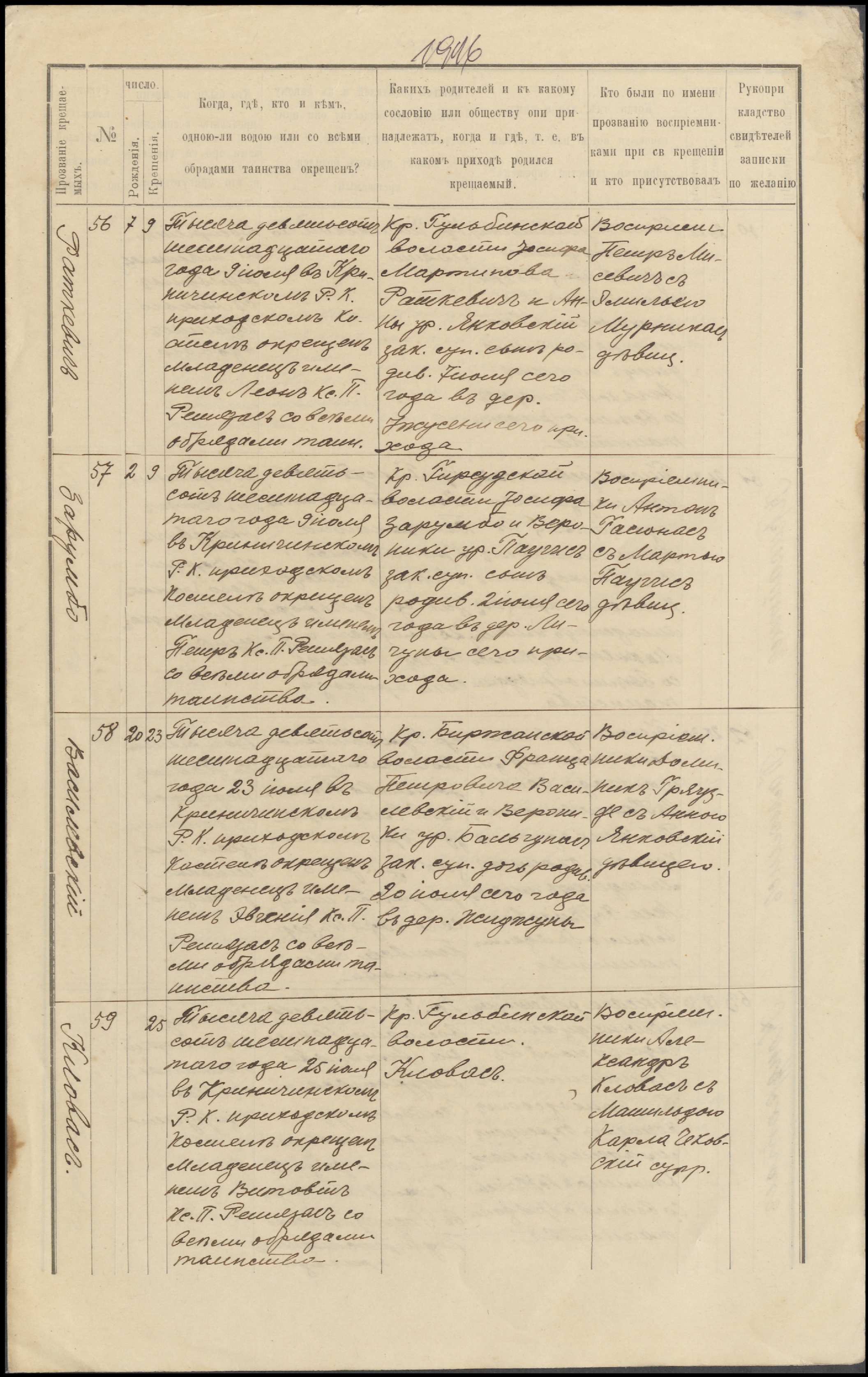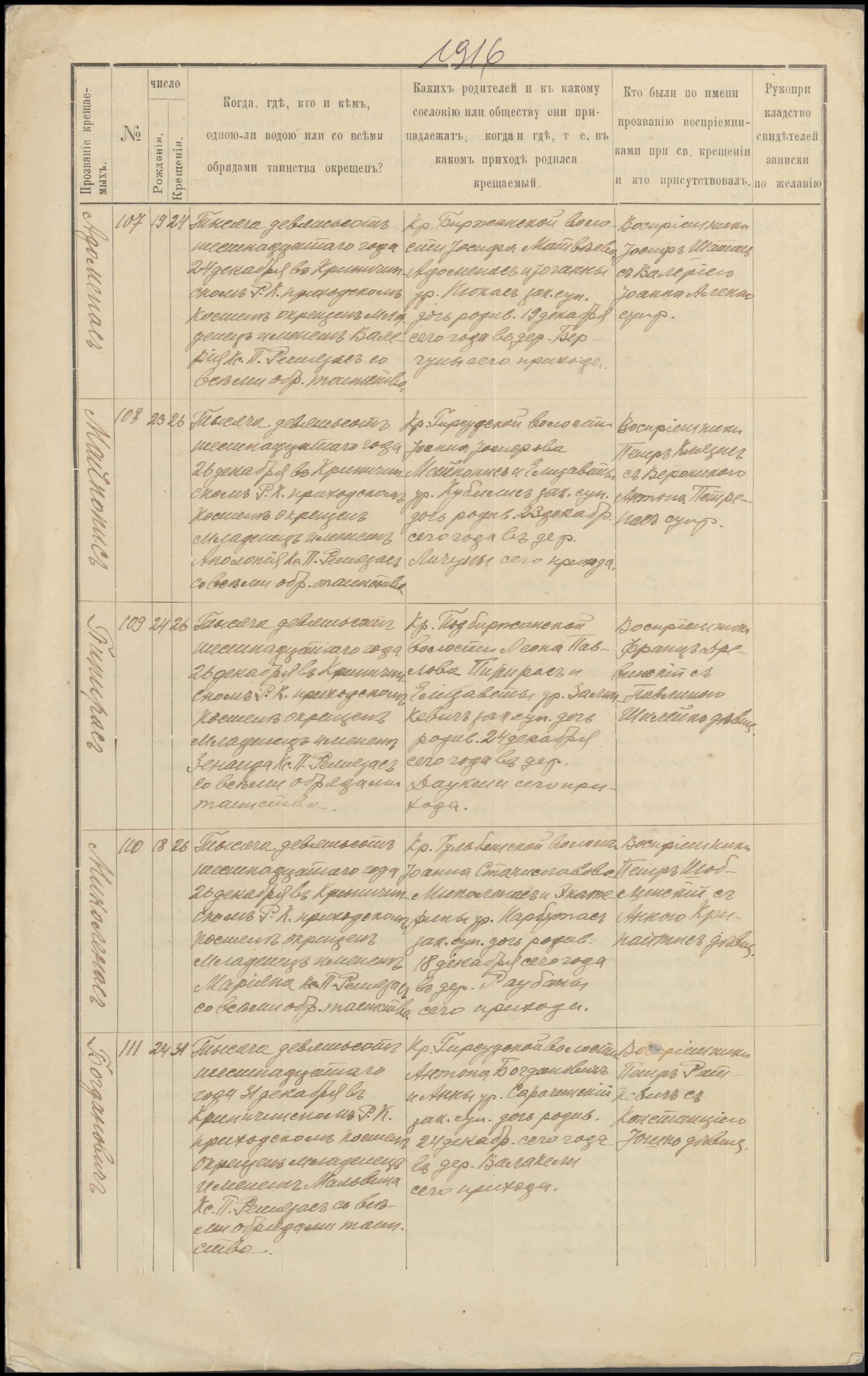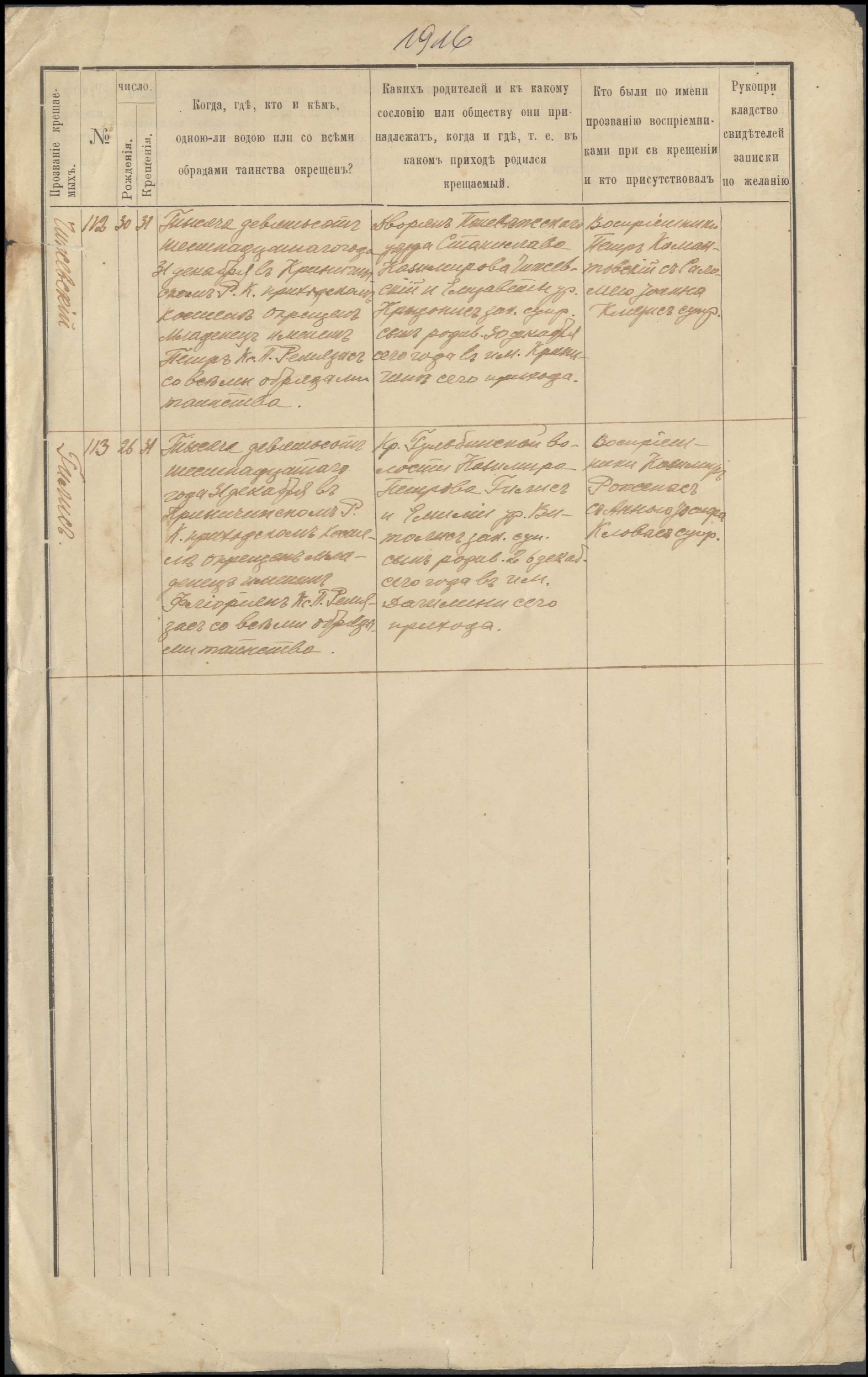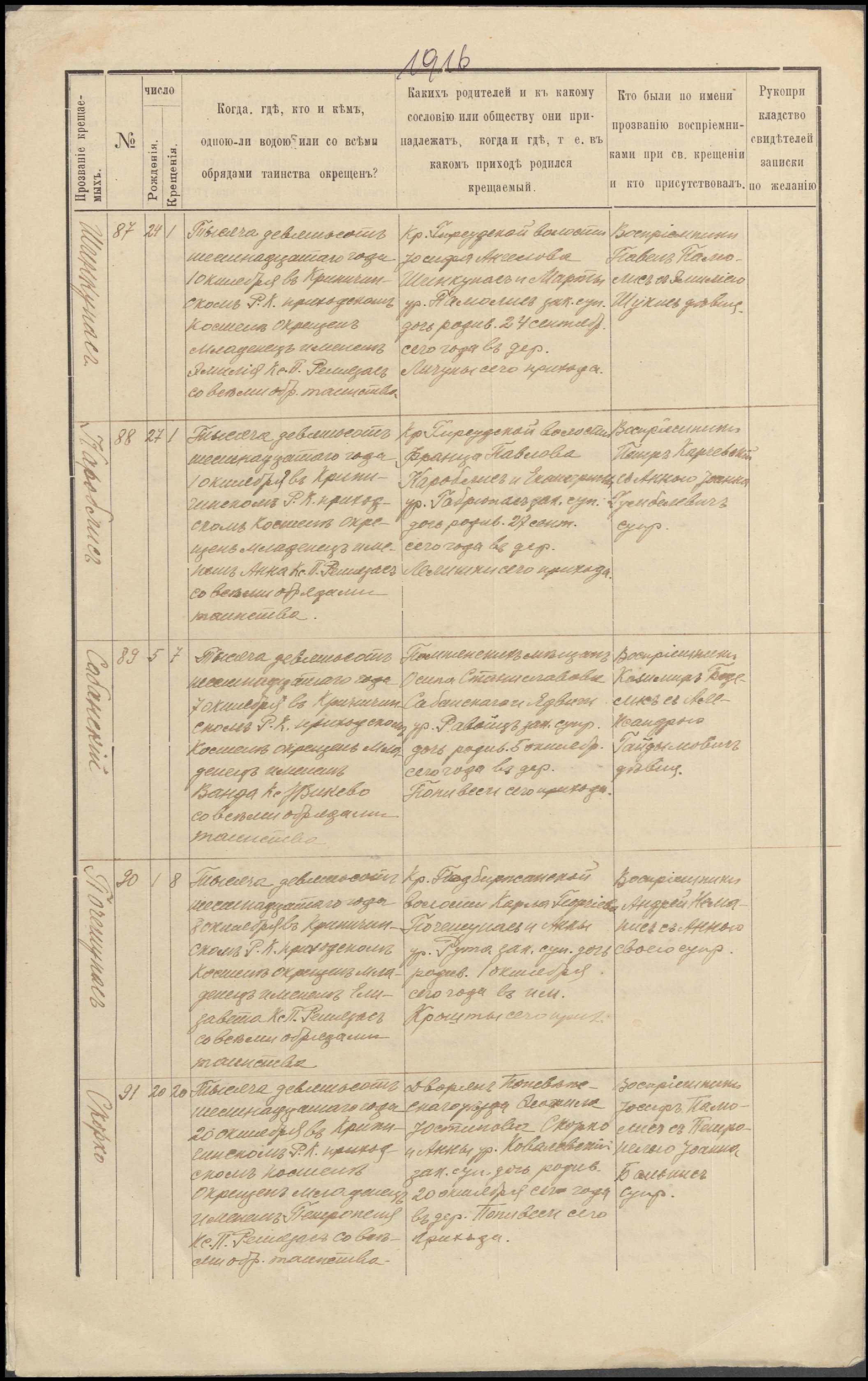 Krinčino Romos katalikų parapijos bažnyčios 1916 metų krikšto ir jungtuvių metrikų kopijos, fragmentai