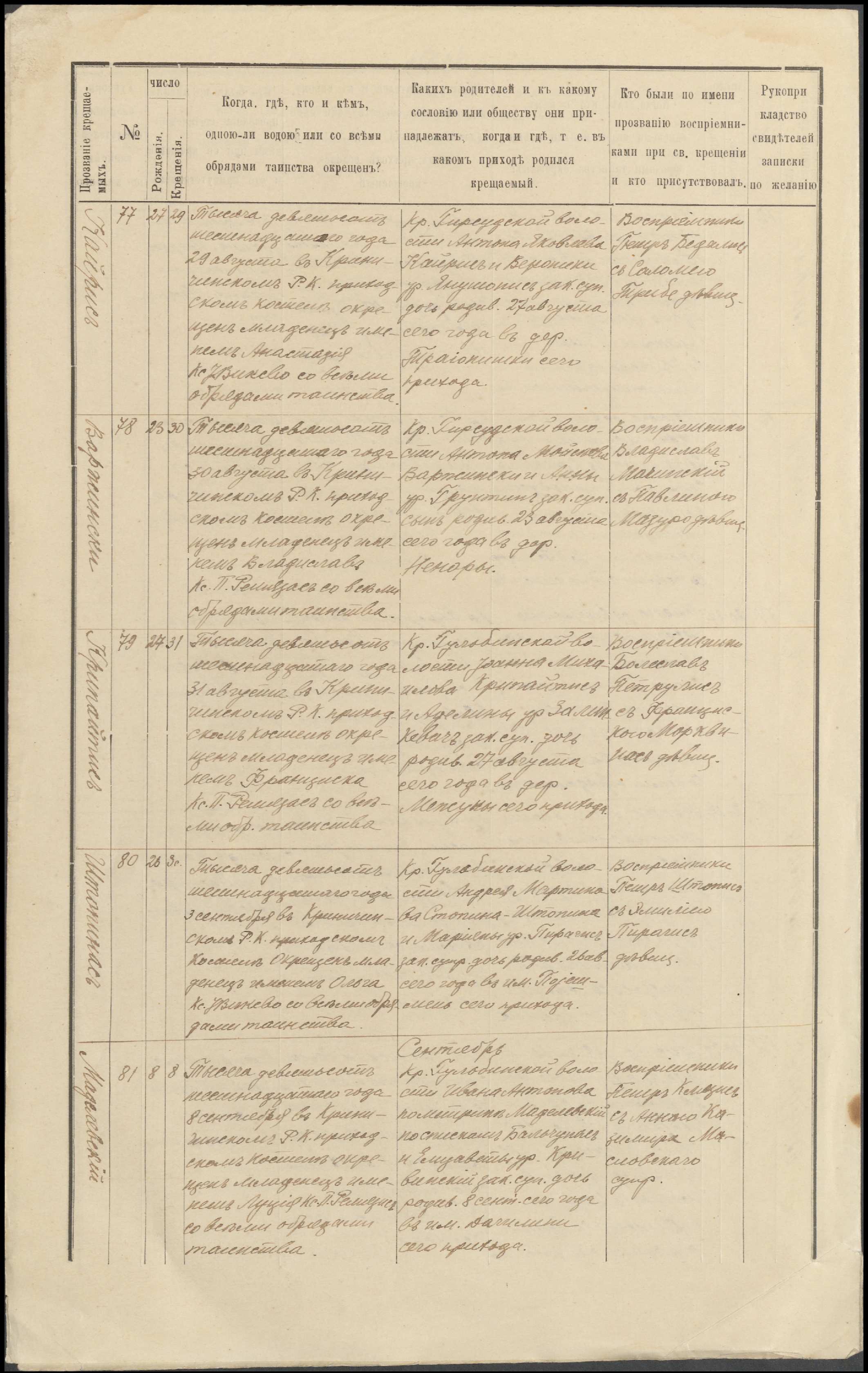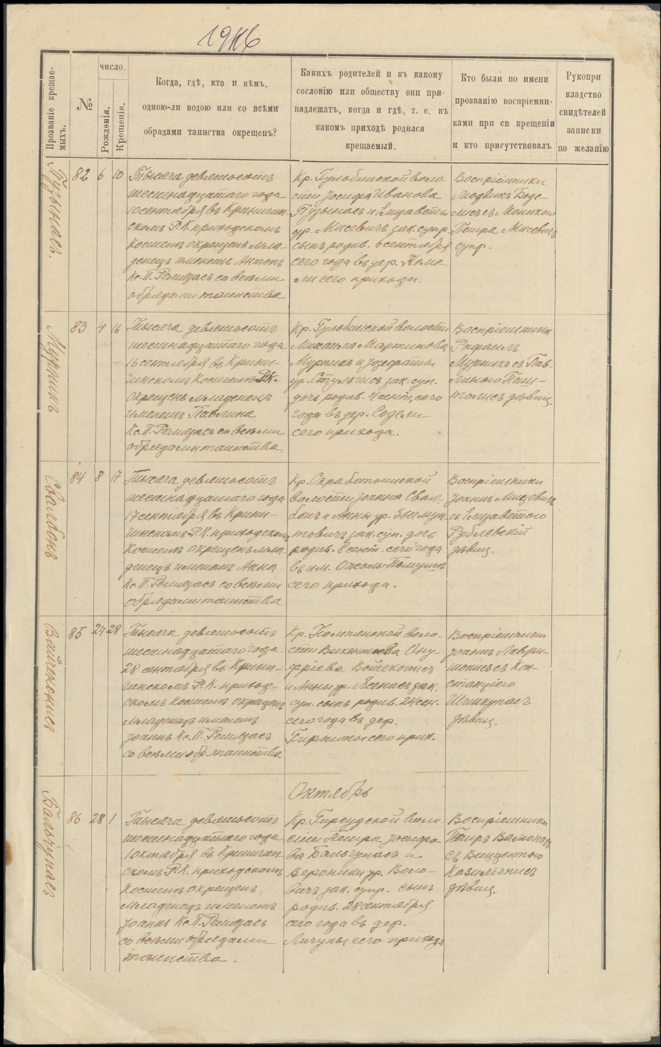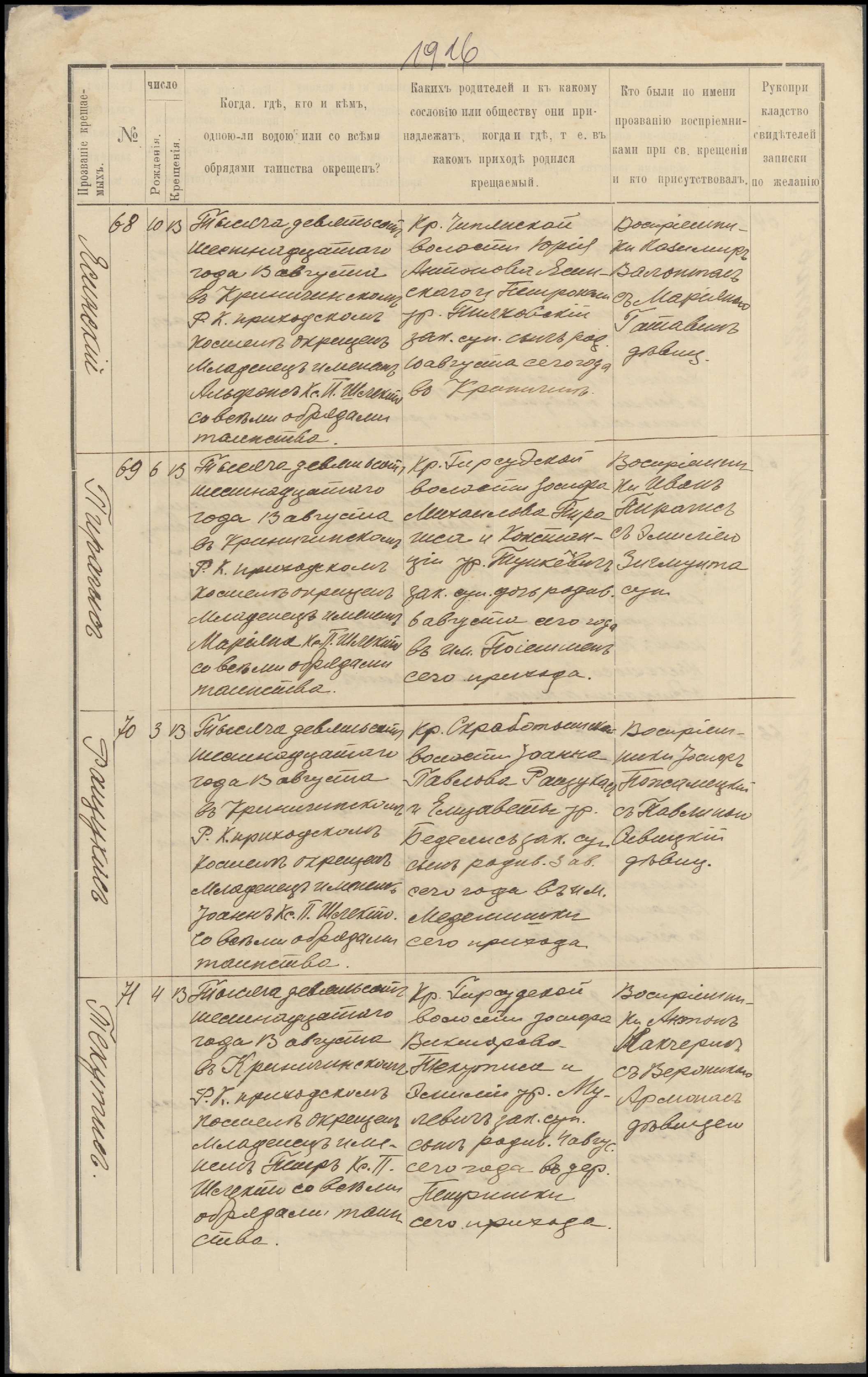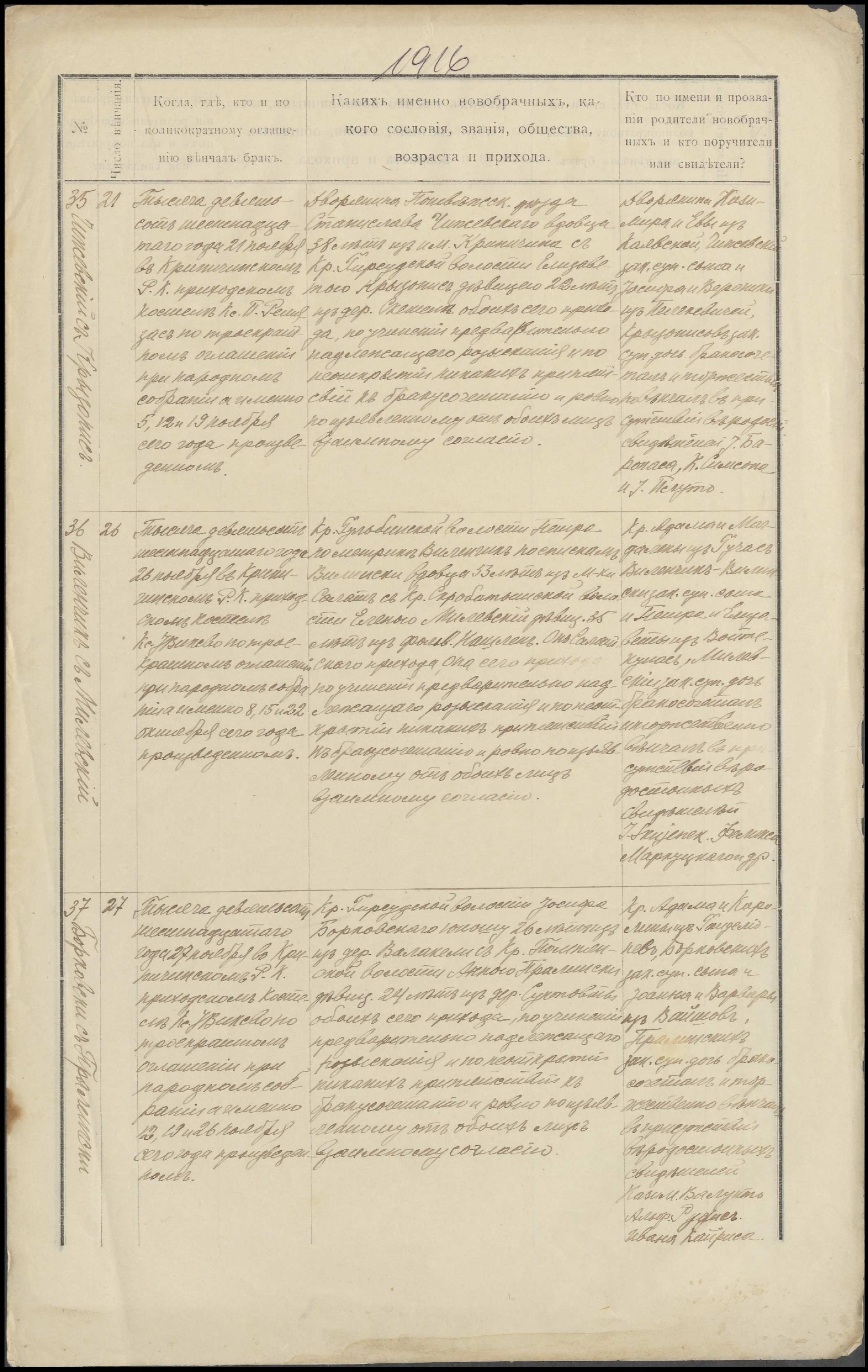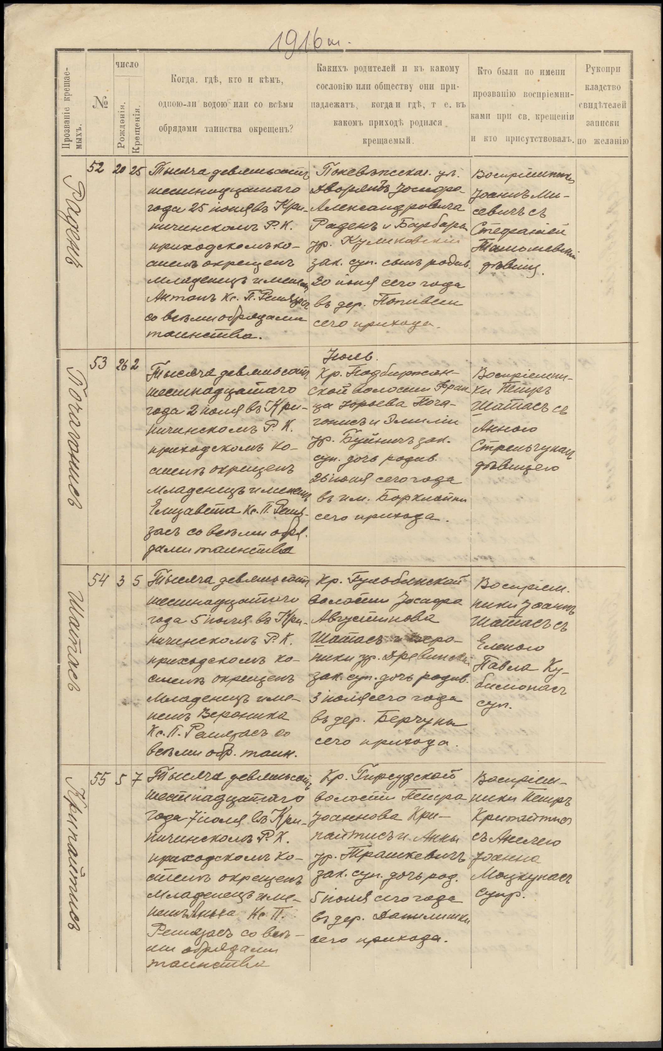 Krinčino Romos katalikų parapijos bažnyčios 1916 metų krikšto ir jungtuvių metrikų kopijos, fragmentai