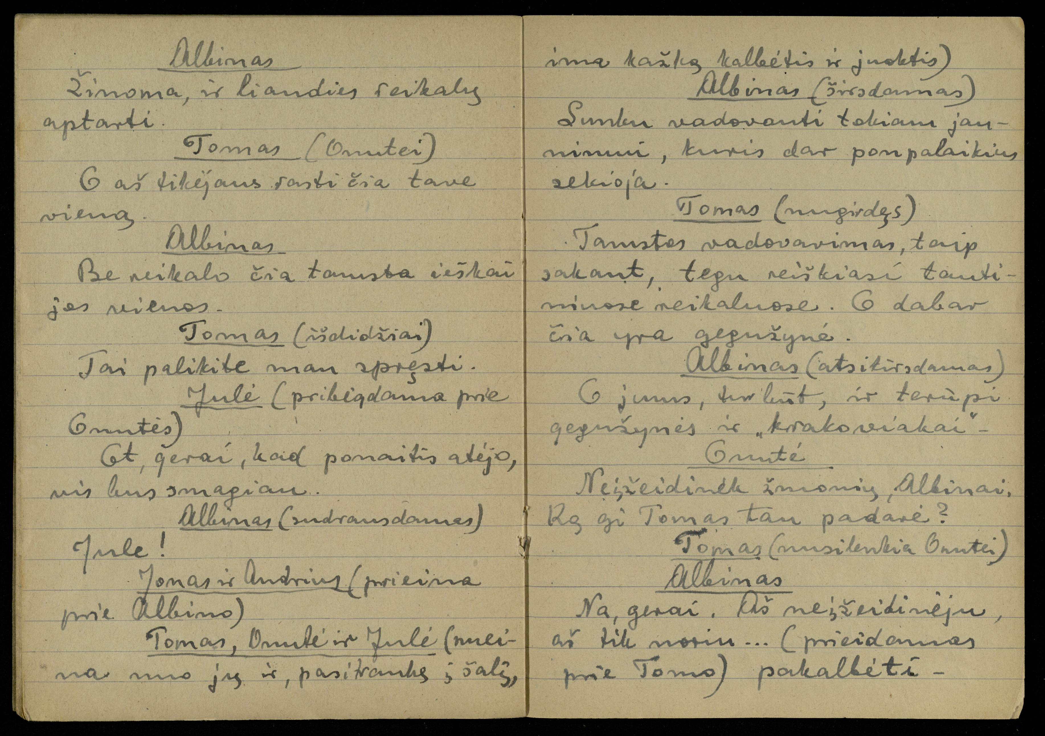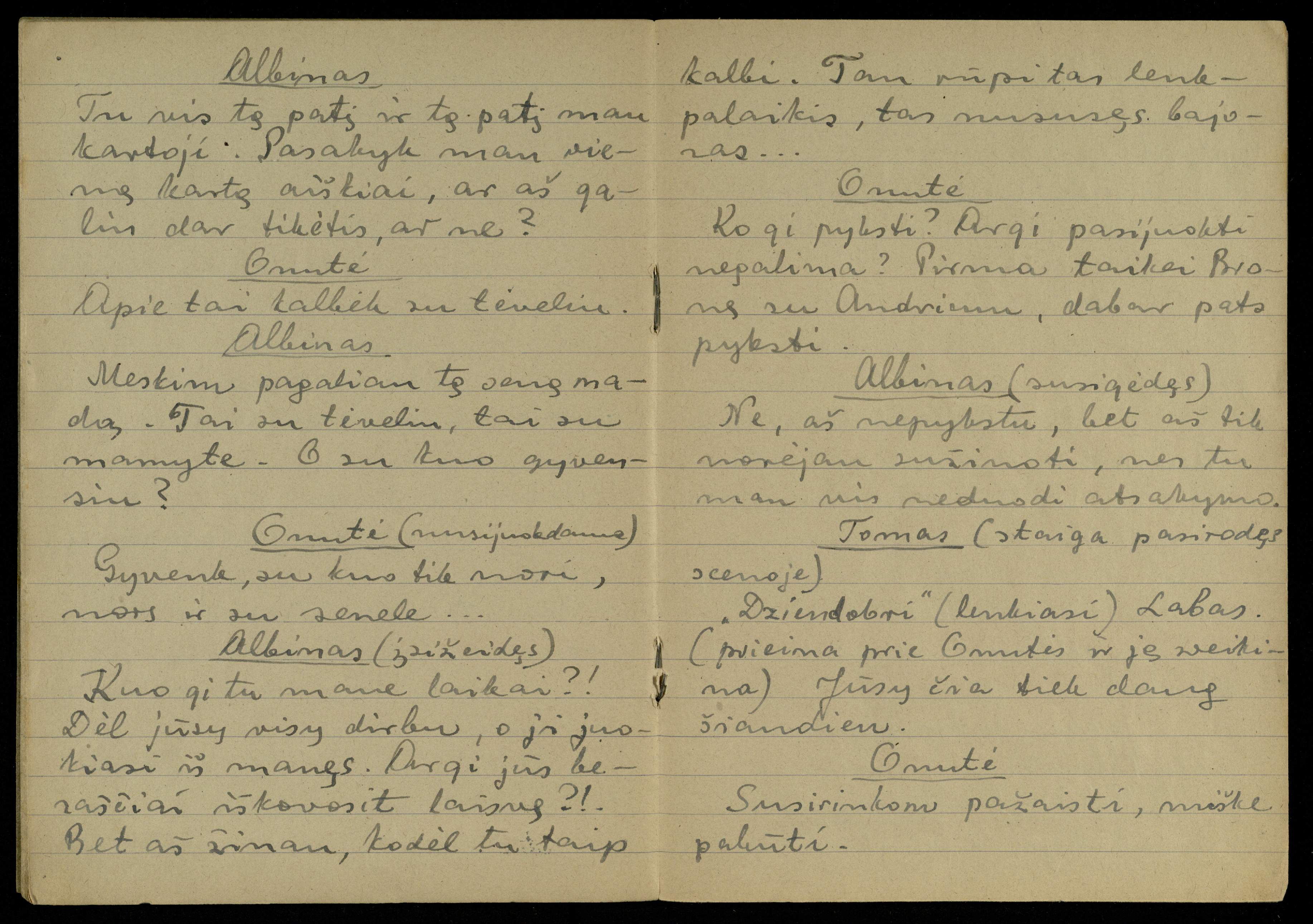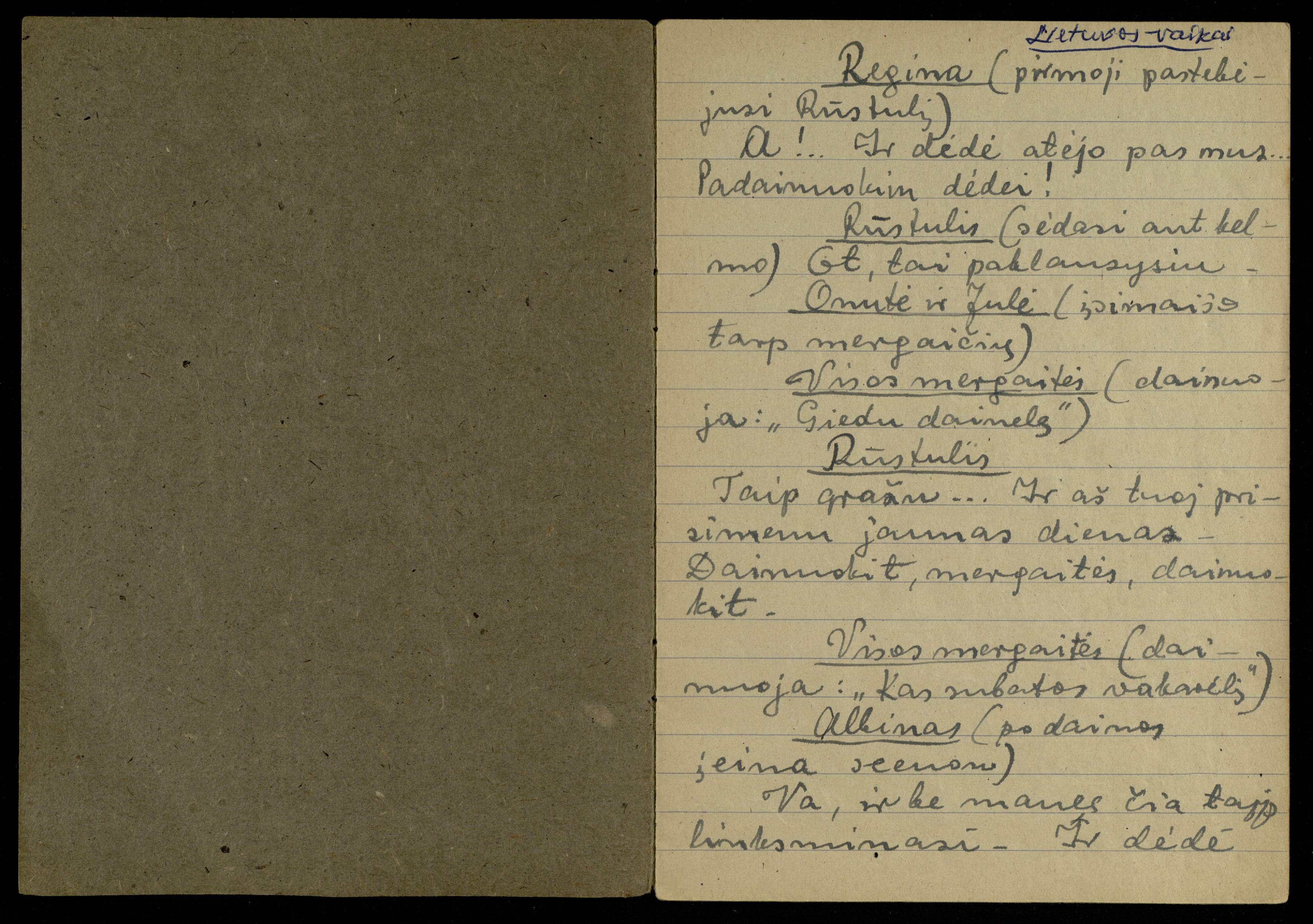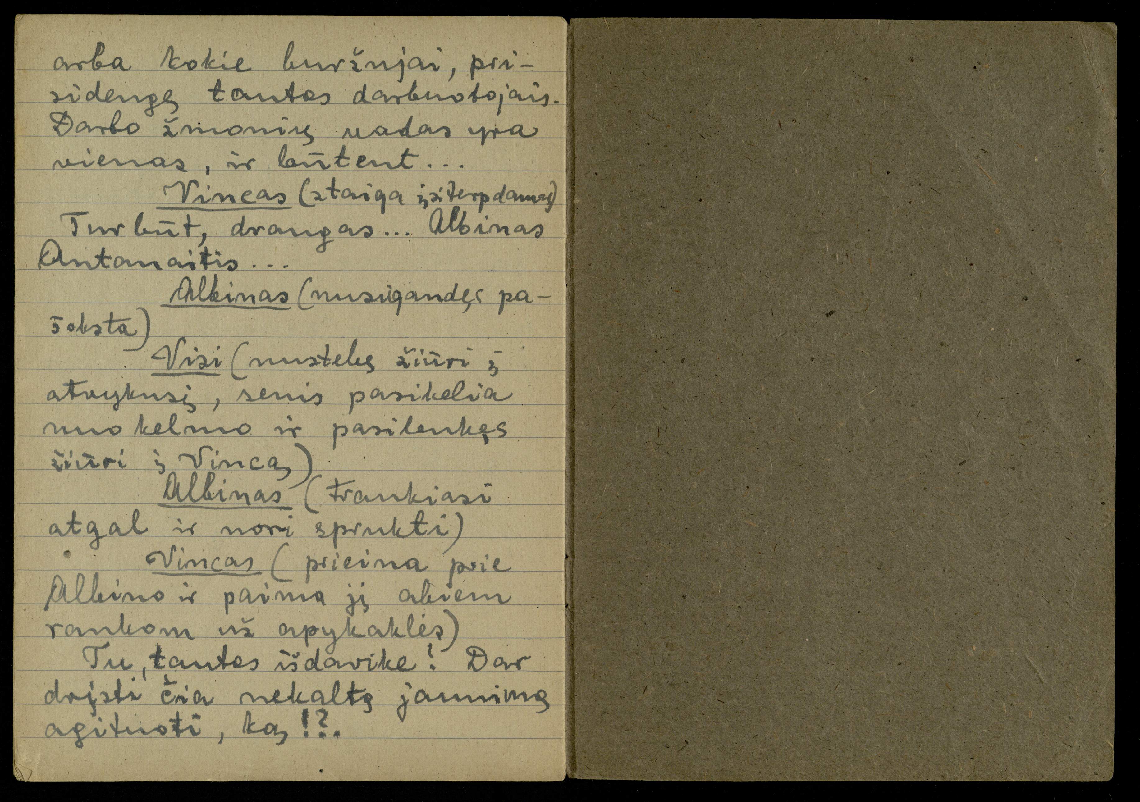 Scenos veikalas, 2 sąsiuviniai. Kraštiečio rašytojo, „Tėviškės žiburių“ redaktoriaus Česlovo Senkevičiaus dovana gimtajam Pasvalio kraštui.