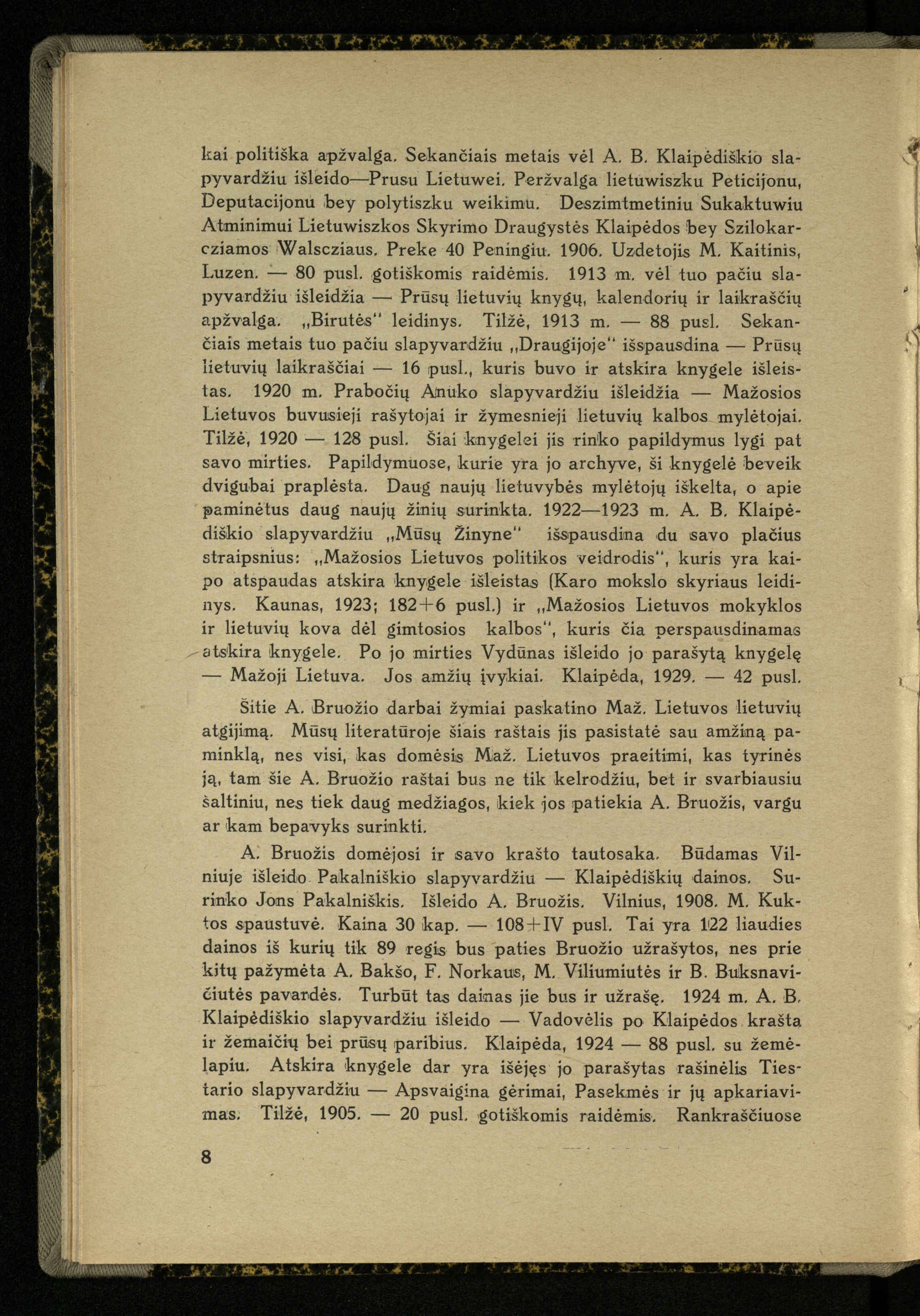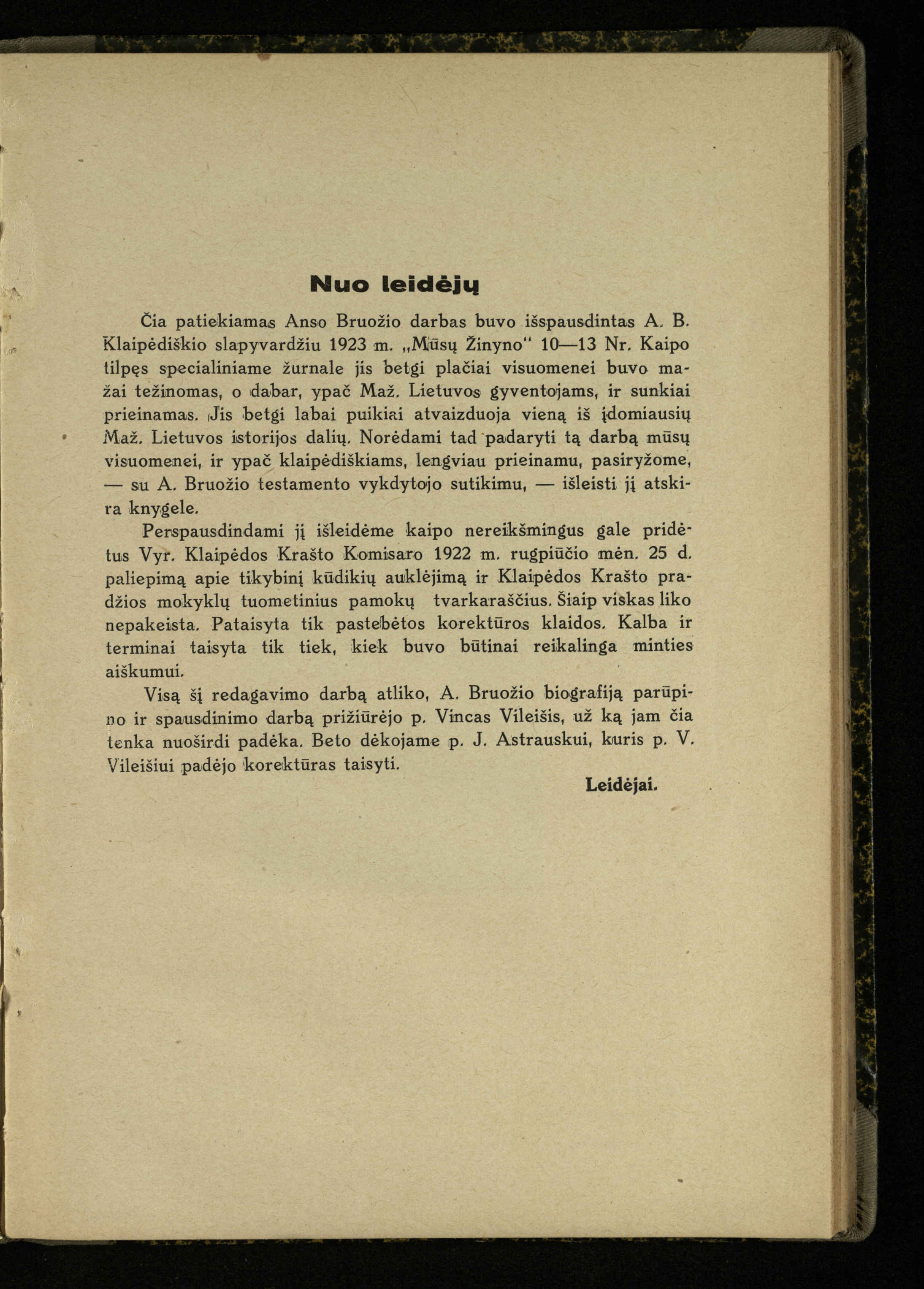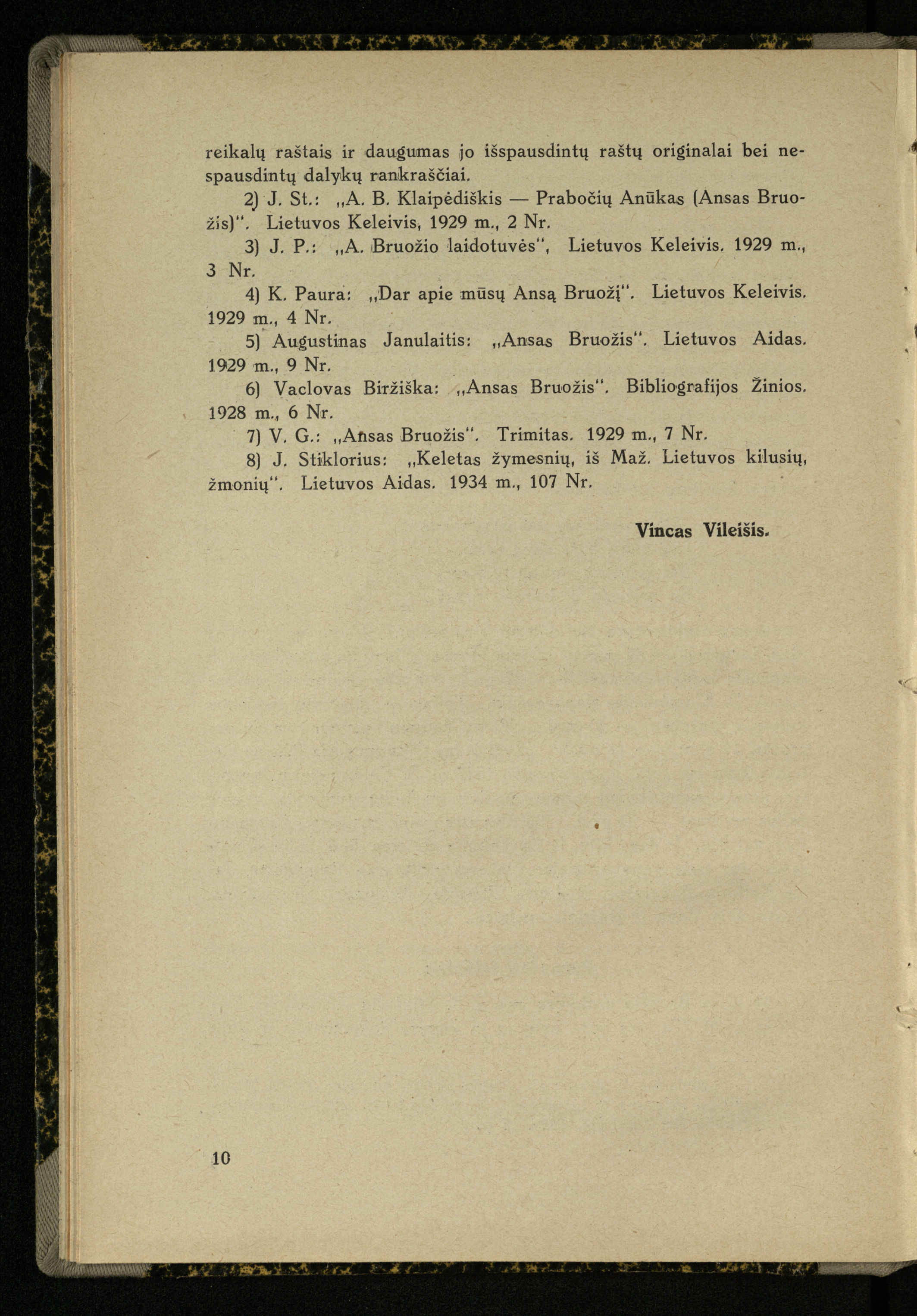 Mažosios Lietuvos mokyklos ir lietuvių kova dėl gimtosios kalbos / Ansas Bruožis; redagavo Vincas Vileišis. – Kaunas: Didž. ir Maž. Lietuvos kultūr. bendradarbiavimo s-gos Finansų m-jos tarnautojų skyriaus leidinys, 1935. – 94, [2] p.