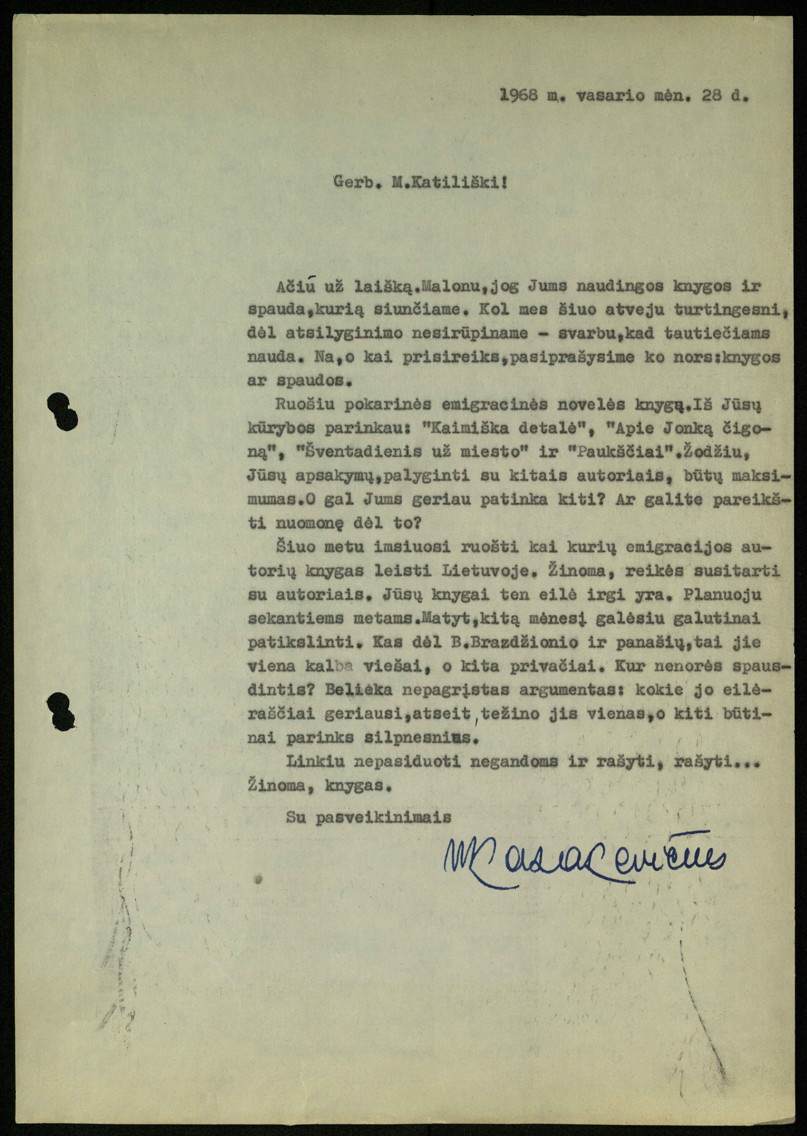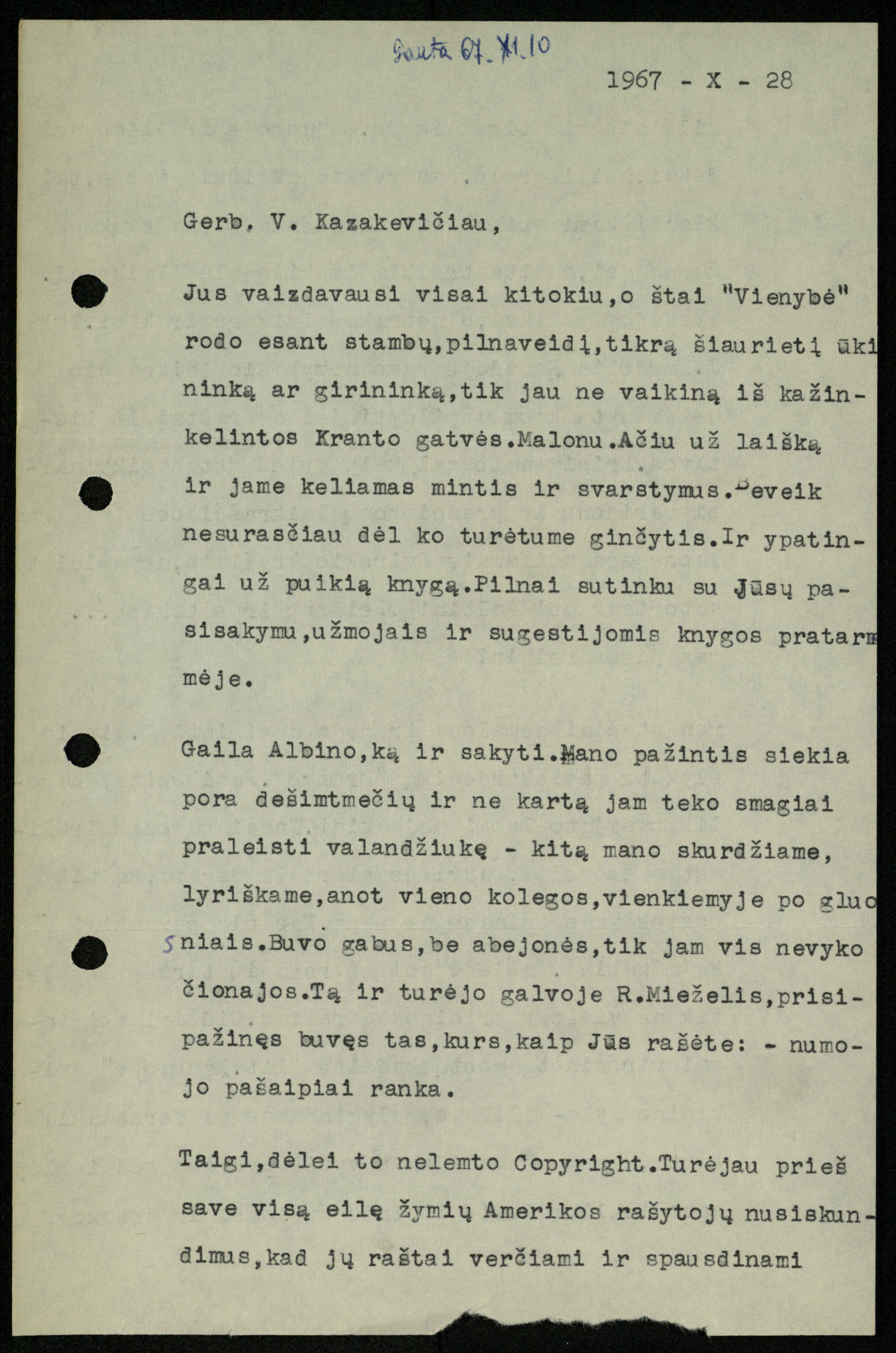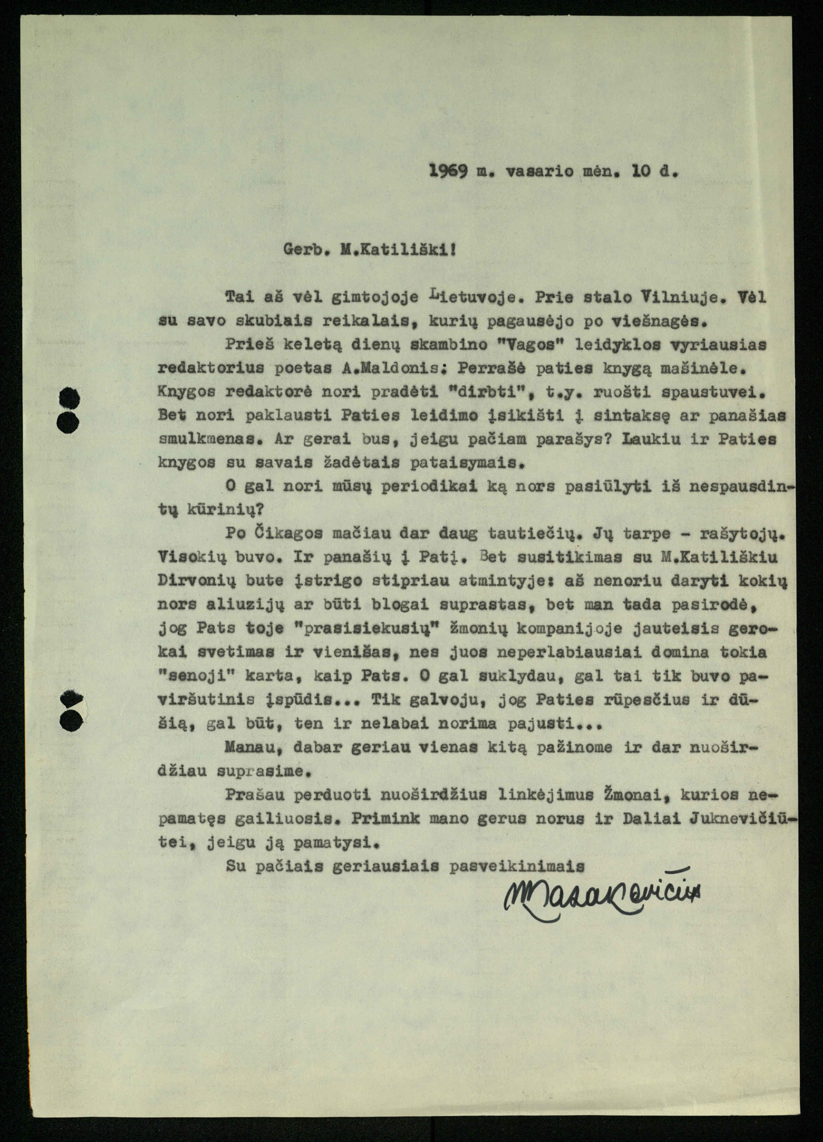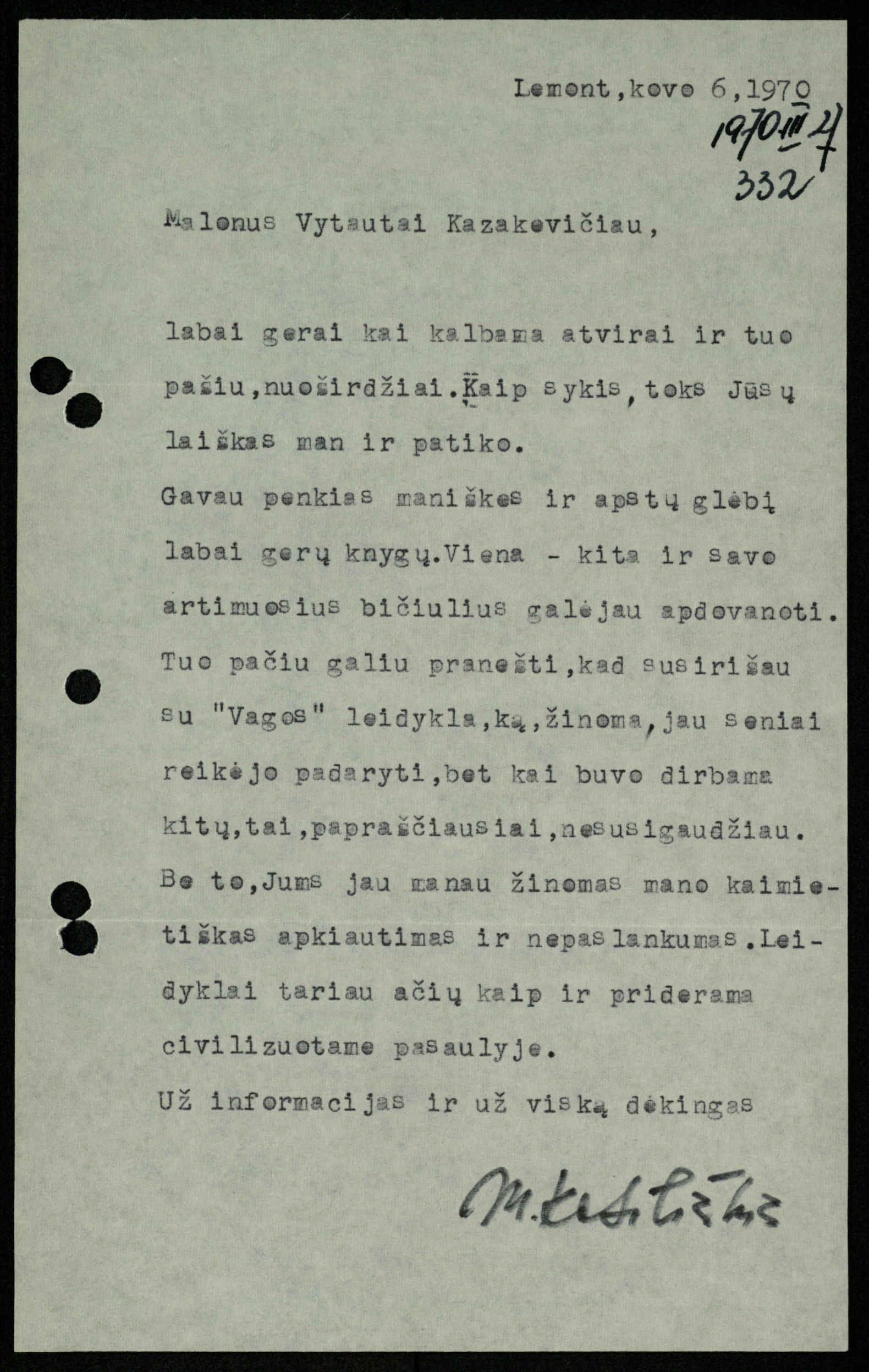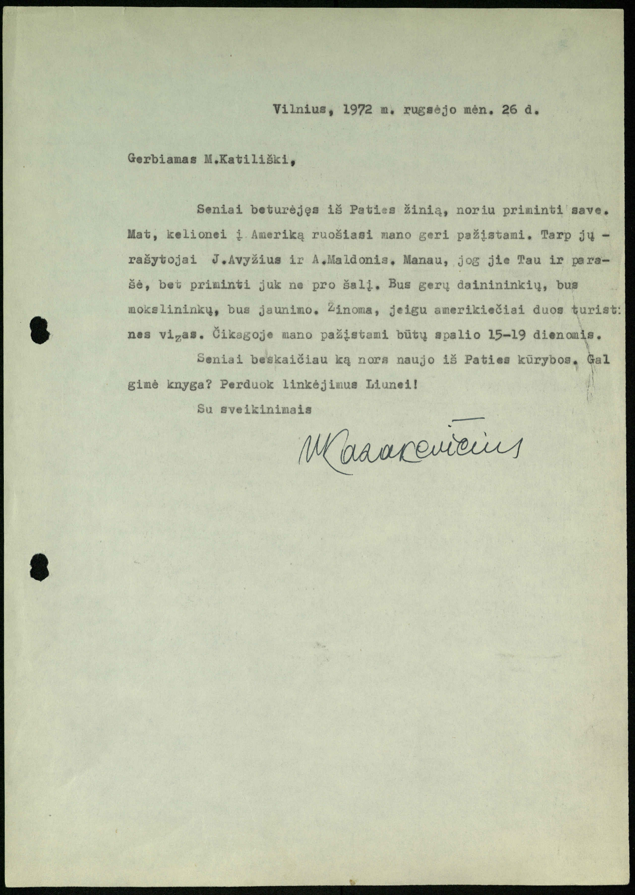 Žurnalisto Vytauto Kazakevičiaus ir rašytojų Mariaus Katiliškio, Zinaidos Nagytės-Katiliškienės korespondencija. 1966–1984 m.