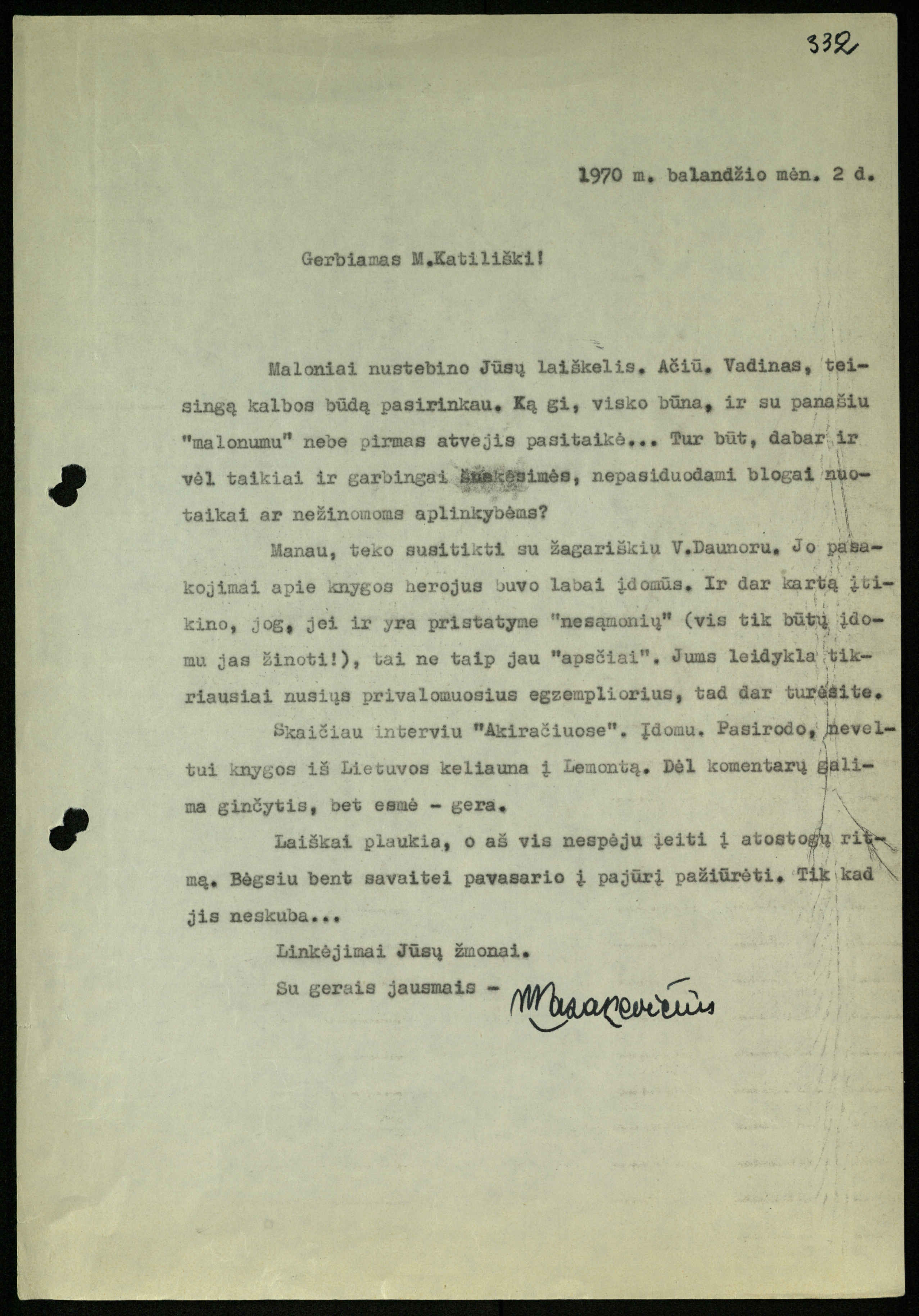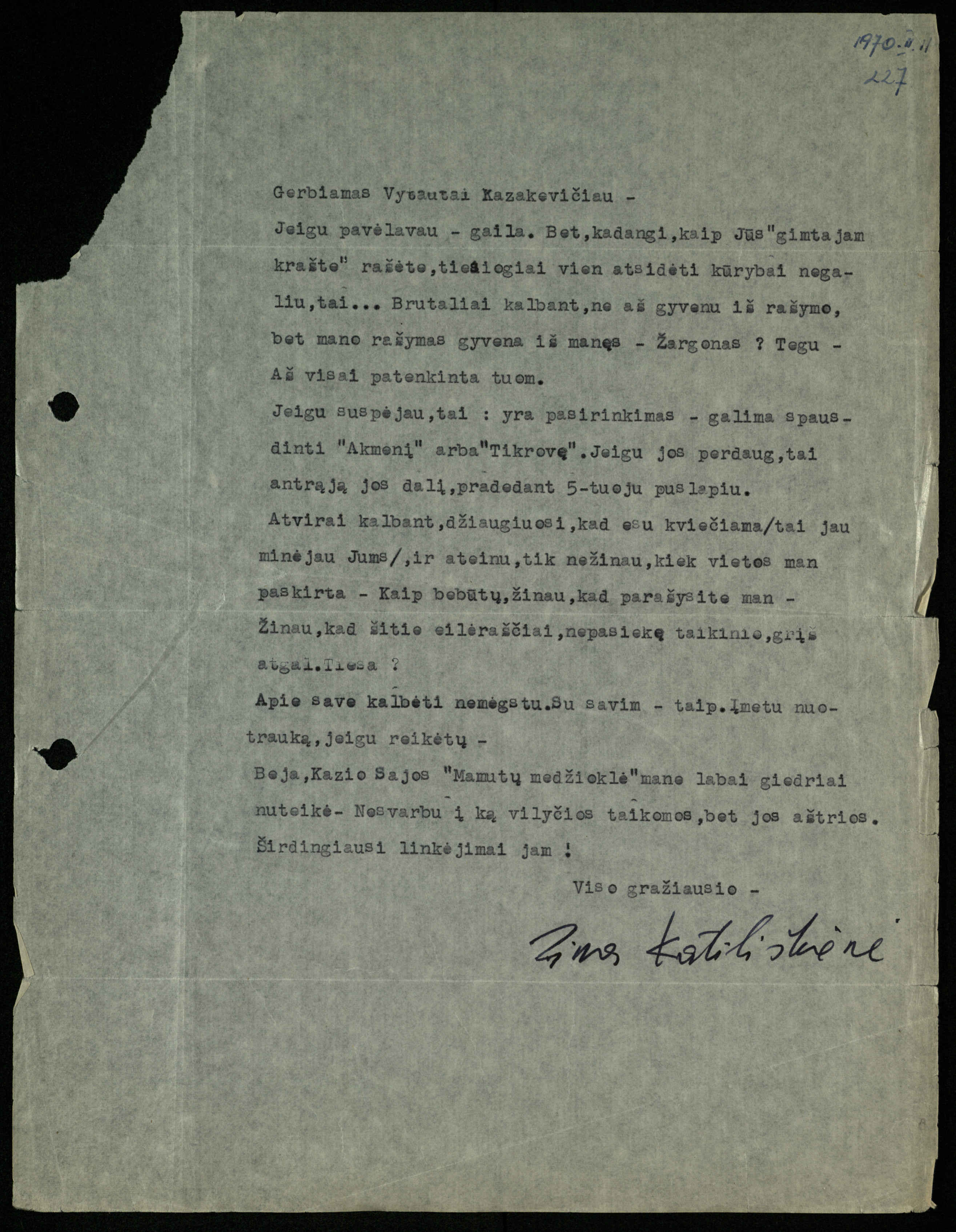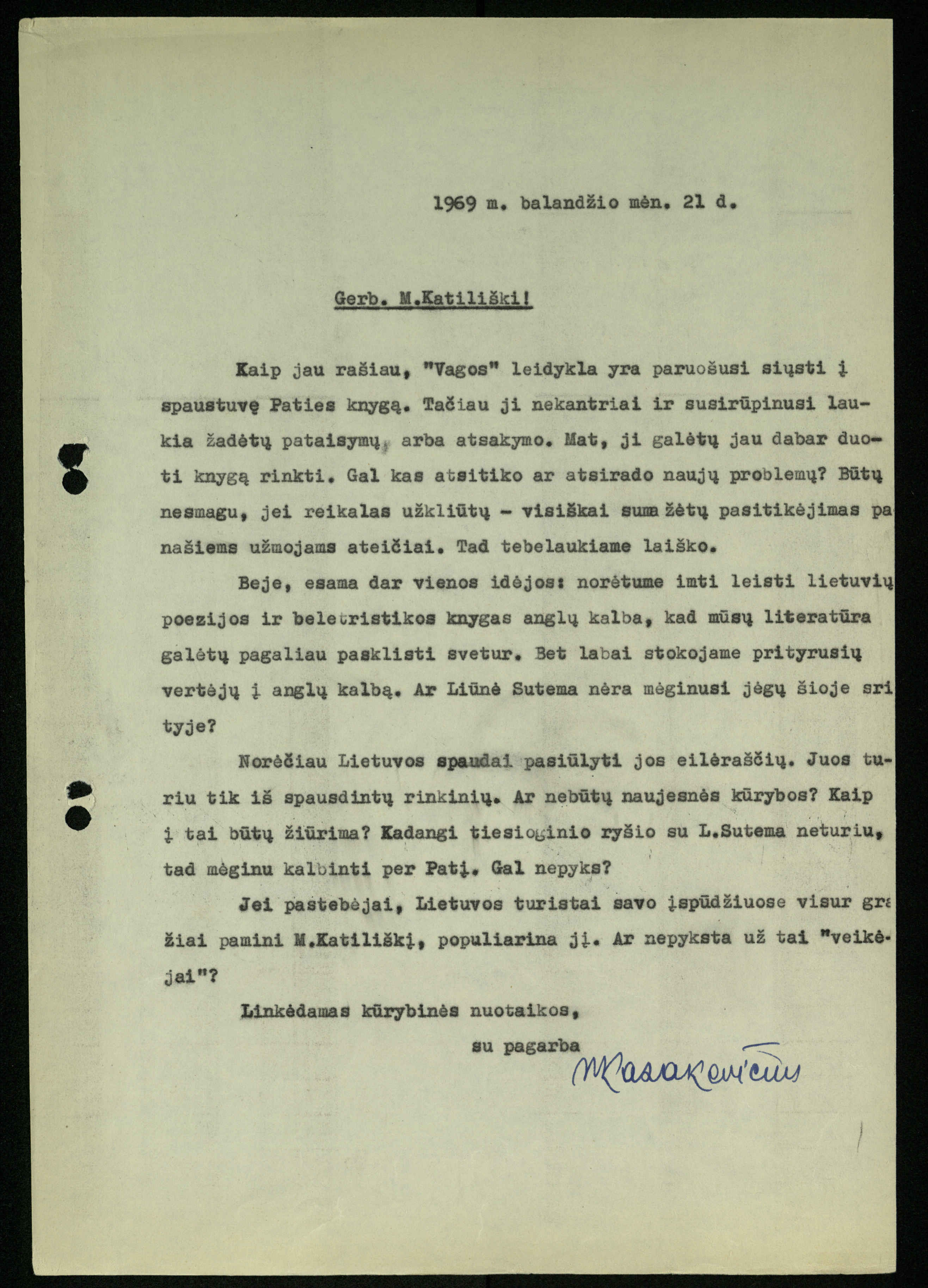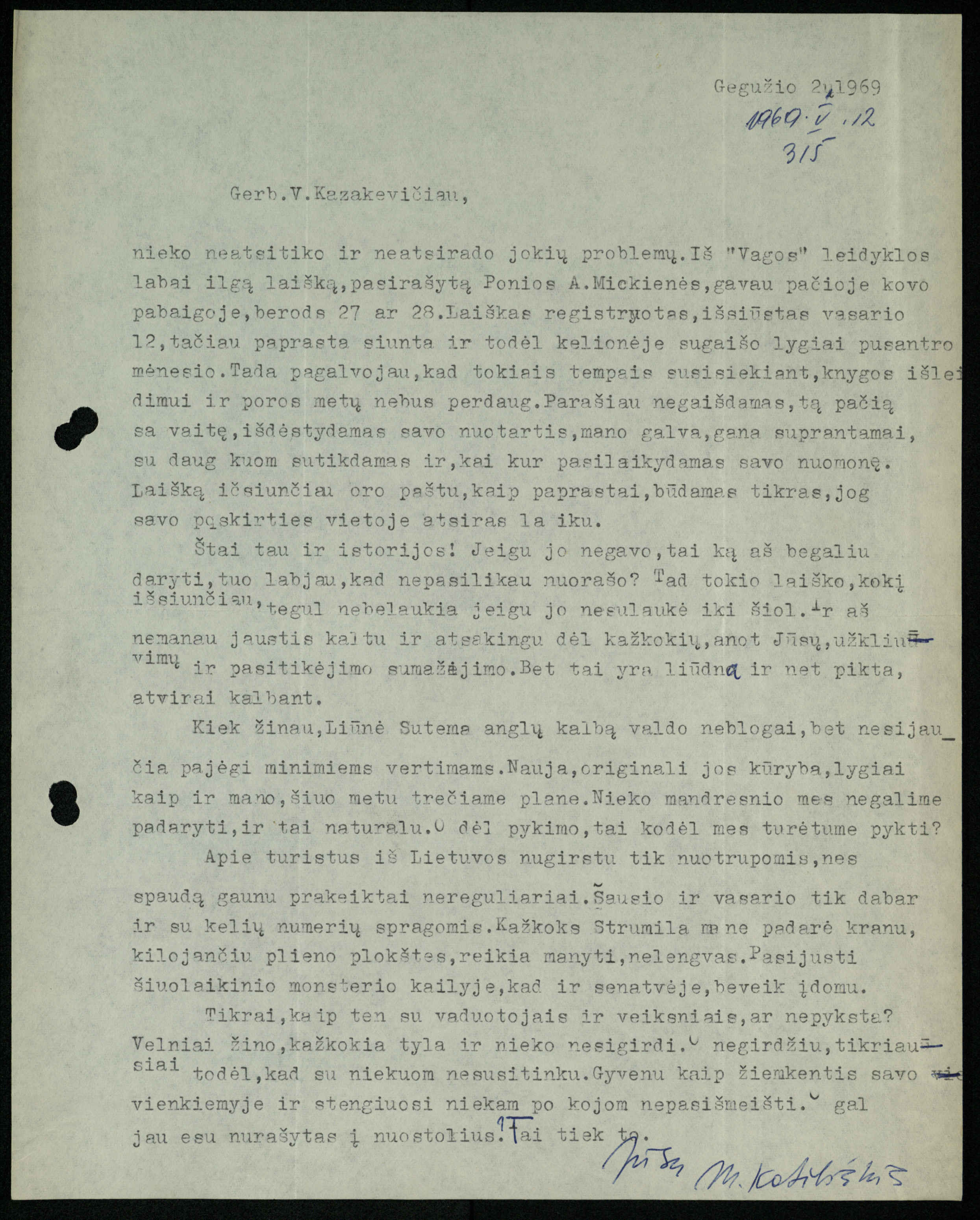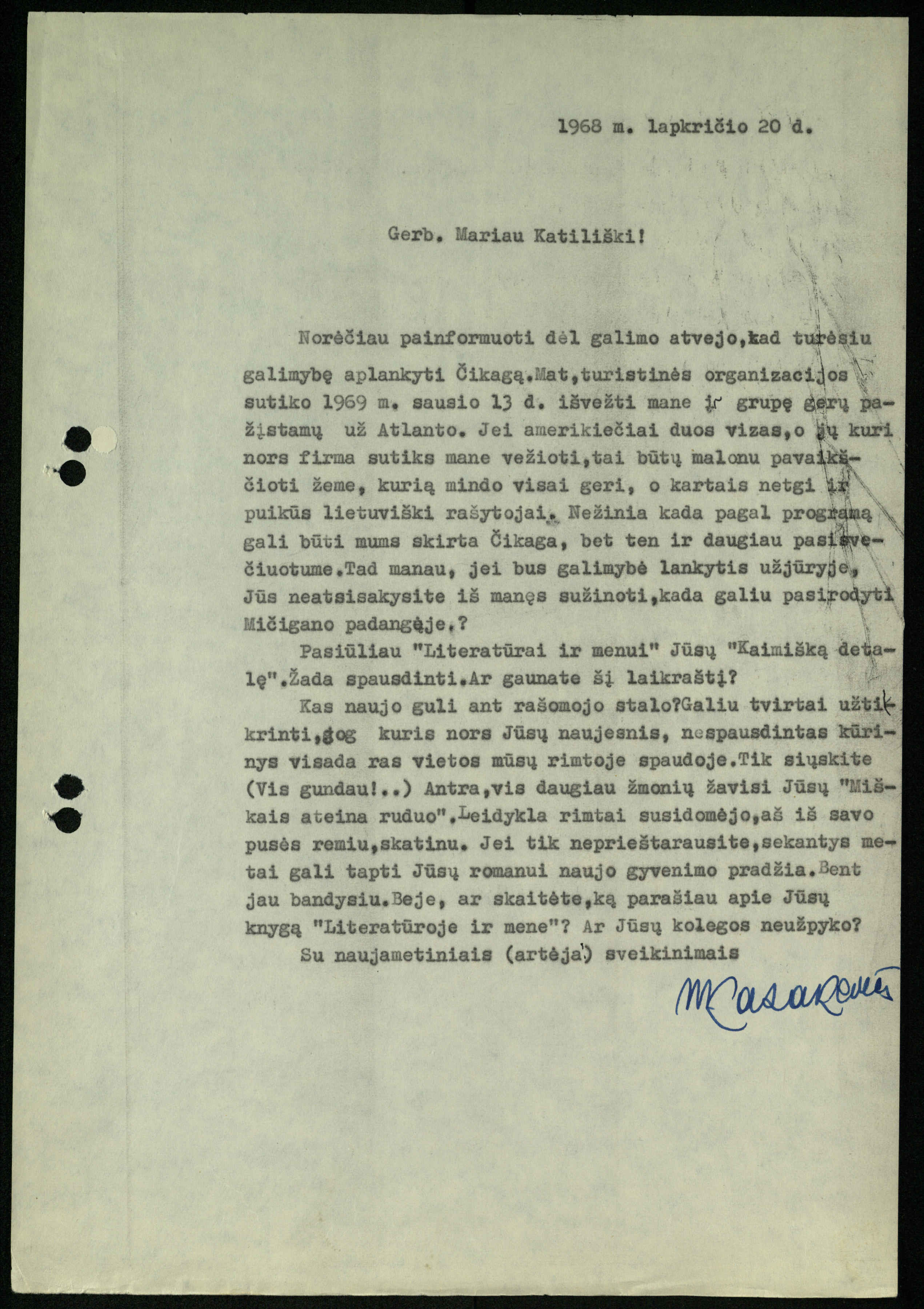 Žurnalisto Vytauto Kazakevičiaus ir rašytojų Mariaus Katiliškio, Zinaidos Nagytės-Katiliškienės korespondencija. 1966–1984 m.