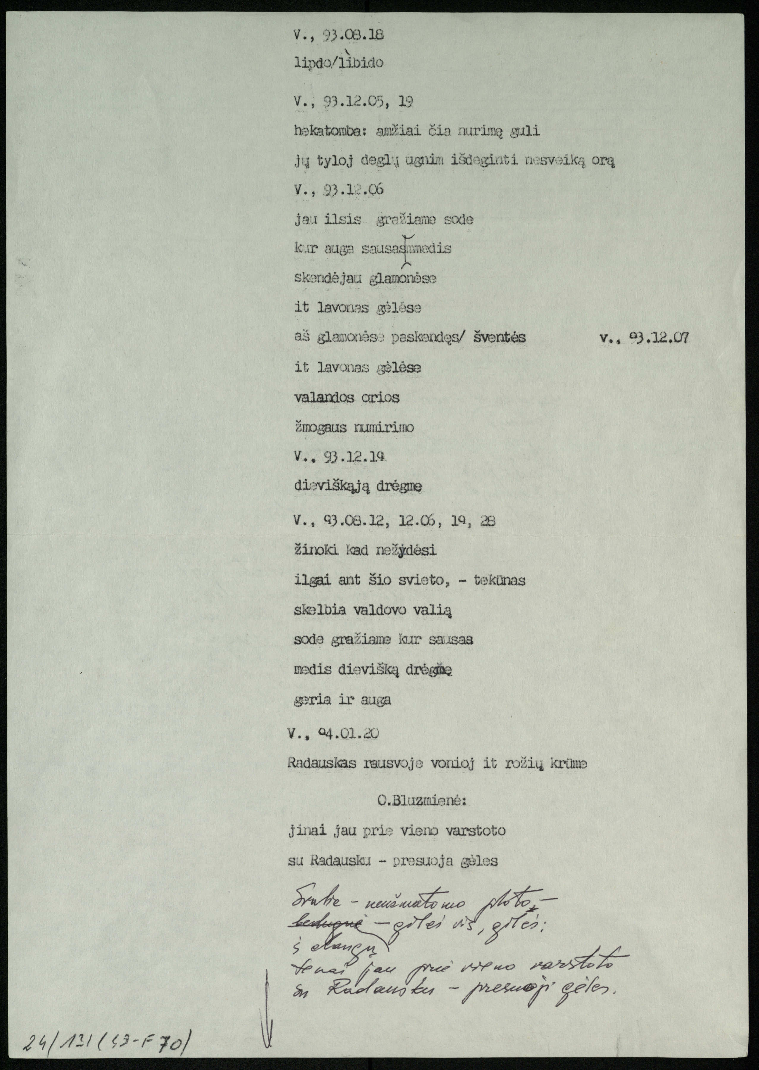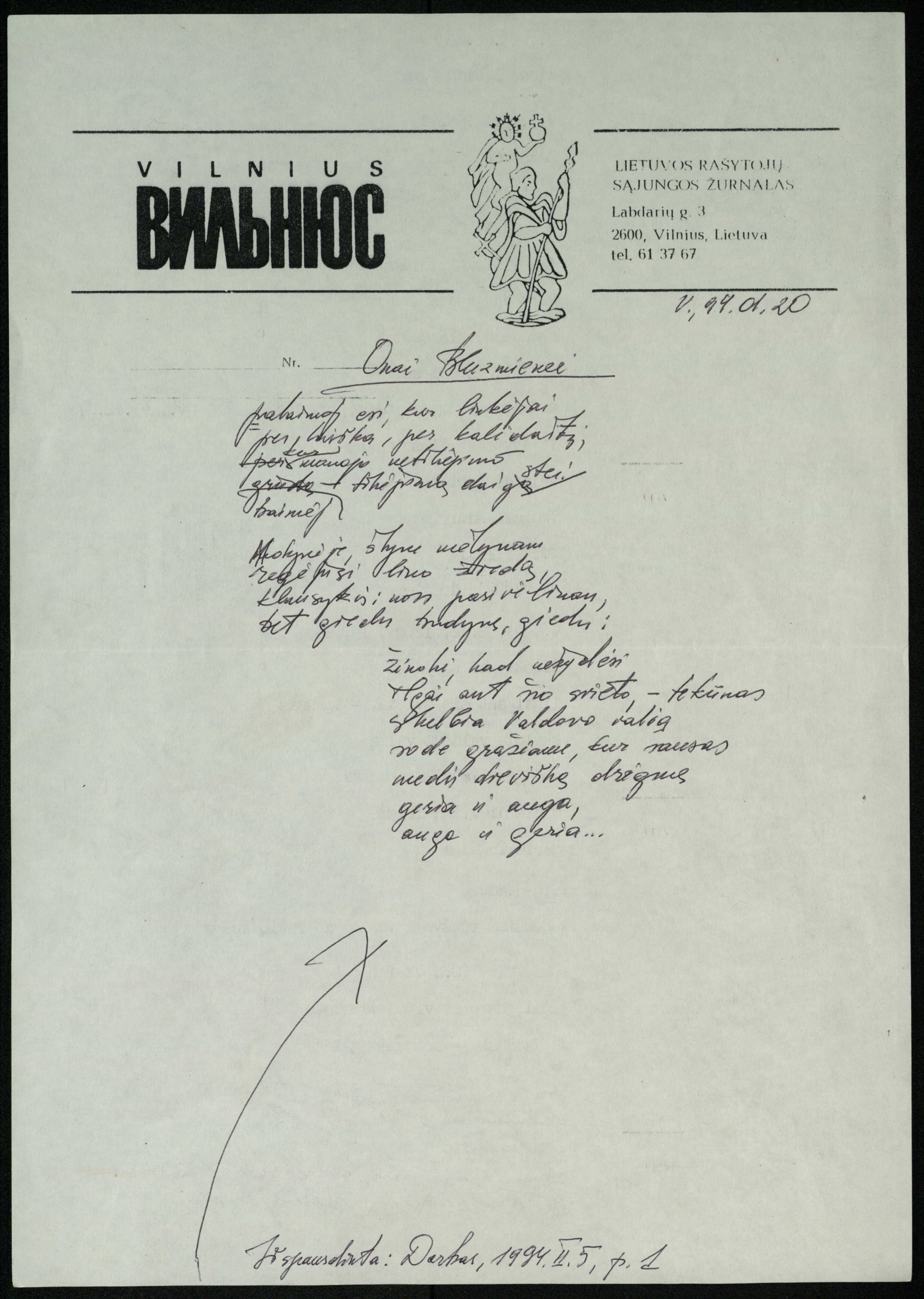 Rankraštis. Vladas Braziūnas. Onai Bluzmienei. 1994 m.
