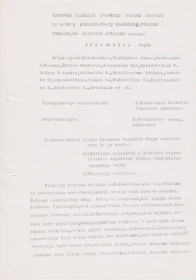 Lietuvos Sąjūdžio Pasvalio rajono tarybos ir grupių koordinatorių posėdžio, įvykusio 1990.10.04 Pasvalio kultūros namuose, PROTOKOLAS Nr. 23
