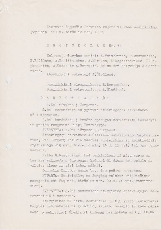 Lietuvos Sajūdžio Pasvalio rajono Tarybos susirinkimo, įvykusio 1991 m. birželio 12 d., PROTOKOLAS Nr. 14