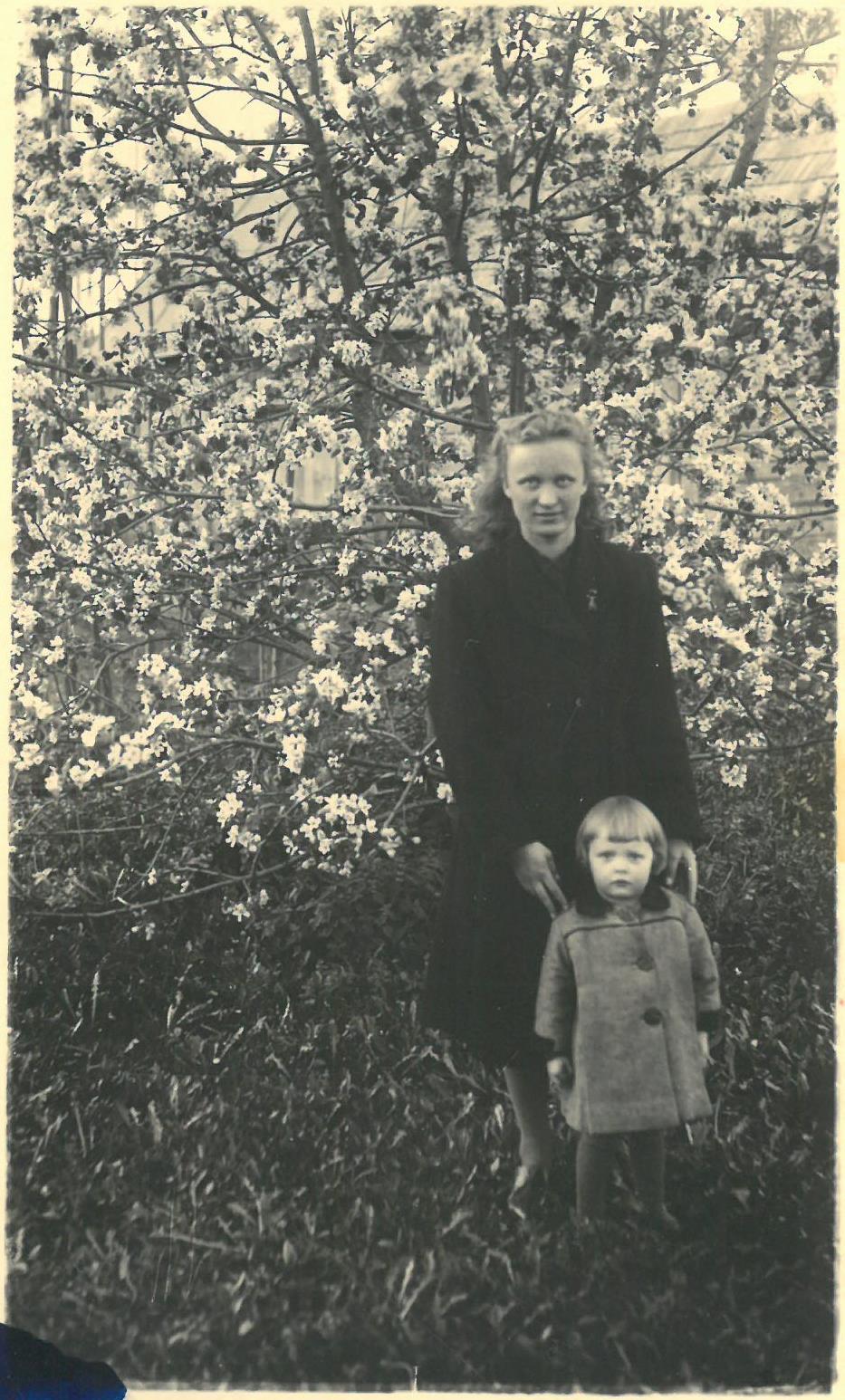 Regina Balčiūnaitė su krikšto mama Genovaite Pečiuliene Rūtų g., Pasvalyje. Kitoje fotografijos pusėje yra Pasvalyje veikusios fotoateljė antspaudas su užrašu: „FOTO / Adamkavičiaus / 1943 VI 2“