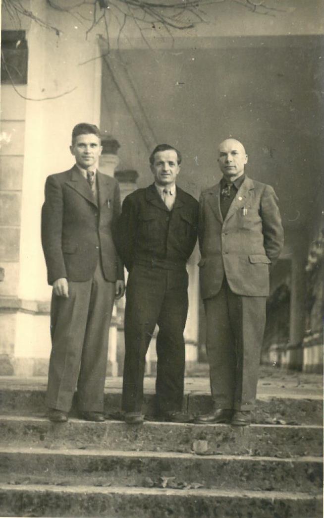 Kazys Balčiūnas (antras iš kairės) su sūnėnu Juliumi Levanu Vokietijoje. Kitoje fotografijos pusėje yra užrašas: „Prisiminimui [neįskaitomas miesto pavadinimas] / dėdei / Julius / 1948 lapk. mėn. 6 d.“