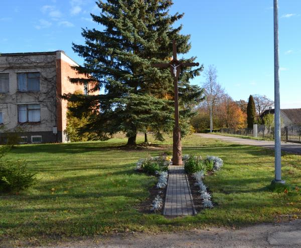 The cross to the people of Pervalkai sits on the border between the new and the old villages, at the junction of streets Ežero and Bronius Krivickas. There was a large oak cross previously at the same place. It was erected in 1939 by the priest Magnus Kazėnas who had spent many years in America. The cross decayed with the time and disintegrated. The community of the village of Pervalkai decided to replace it with a new one. In 2012 the local farmer Linas Niurka donated an oak tree and Vytautas Jackūnas from Pasvalys made an impressive new cross out of it. The cross was consecrated by Pasvalys church parson Albertas Kasperavičius in June 20, 2015.
