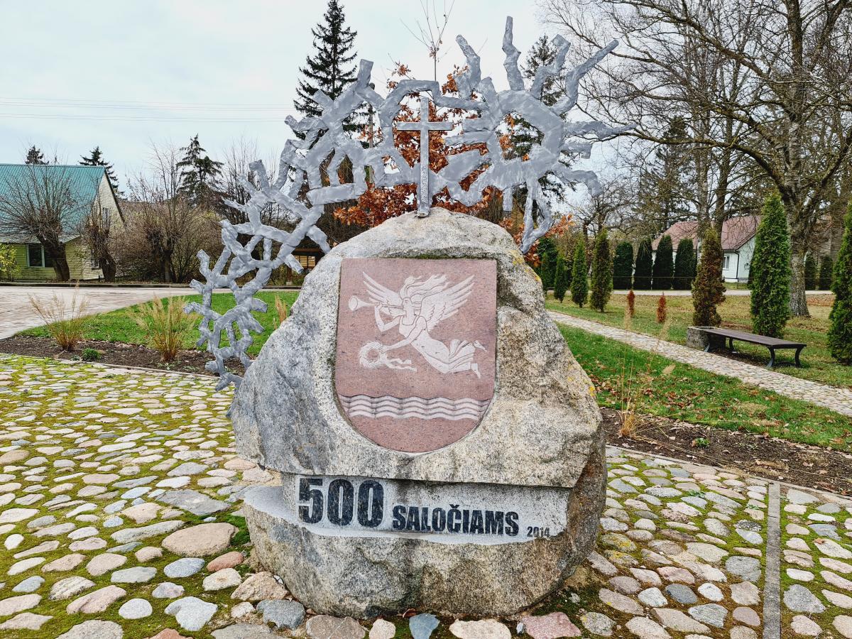 Paminklinį akmenį miestelio herbu ir užrašu „500 Saločiams. 2014“ papuošė skulptorius, Pasvalio rajono „Rats“ profesionalų menininkų klubo narys Valius Remeika, palaimino J. E. Panevėžio vyskupas Lionginas Virbalas.
