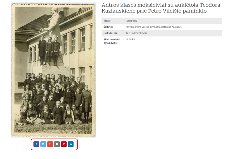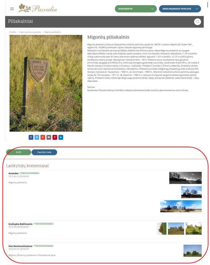 Aptikę ką nors įdomaus Pasvalios duomenų bazėje galite pasidalinti šia informacija su kitais. Tai paprasta ir patogu. Objekto aprašo apačioje spustelėkite ant norimos ikonos, atsidariusiame lange siųskite informaciją paštu arba pasidalinkite informacija ir nuotraukomis su bendraminčiais įvairiuose socialiniuose tinkluose.